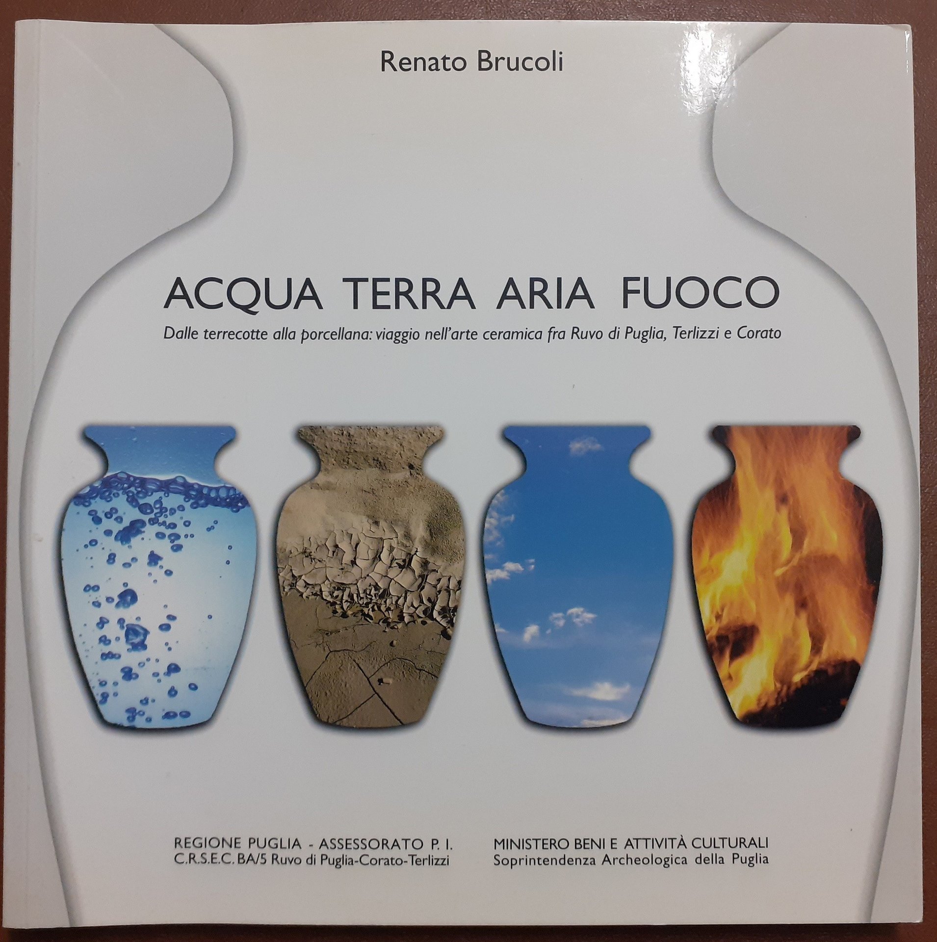 Renato Brucoli, Acqua terra aria fuoco. Dalle terrecotte alla porcellana: viaggio nell’arte ceramica fra Ruvo, Terlizzi e Corato, con contibuti di Rosa Maria Faenza Jatta, Palma Labellarte, Presidi e docenti dell’Istituto Statale d’Arte di Corato, s.n., s.l. (ma stampato a Terlizzi, presso la Centrostampa linografica s.n.c.) 2003, pp. 137, ill. b.n. e col., cm 21x21, br. ed. con alette. In testa al frontespizio: Regione Puglia, Assessorato alla Pubblica Istruzione centro Regionale Servizi Educativi e Culturali BA/5 Ruvo di Puglia-Corato-Terlizzi – Ministero per i Beni e le Attività Culturali, Soprintendenza Archeologica della Puglia. Indice: Iolanda Di Terlizzi, Introduzione – Premessa. La traccia sorica: filo segmento o canapo robusto? – Ruvo di Puglia. Il collezionismo (Scheda introduttiva. Non di sole anticaglie – Il Museo Nazionale Jatta. Di madre in figlio: Giulia e Giovannino, i fautori – La collezione. I vasi figurati. Archeologia dotta e dei sentimenti) – Terlizzi. La produzione (Scheda introduttiva. Città della ceramica – Tra giare e fischietti, sognando il marchio di qualità – Leonarda la bisnonna, imprenditrice di fine Ottocento – Che non sia la via? – Con le mani, con la mente, col cuore – Dove passione e argilla è un unico impasto – Busti d’autore e vecchi cantari) – Corato. La formazione (Scheda introduttiva. Per fare scuola – L’Istituto Statale d’Arte. Dai peuceti al futuro – L’arte della ceramica. Forme, idee, decori, fra tradizione e sperimentazione) – Bibliografia. Minime tracce d’uso, per il resto ottimo.