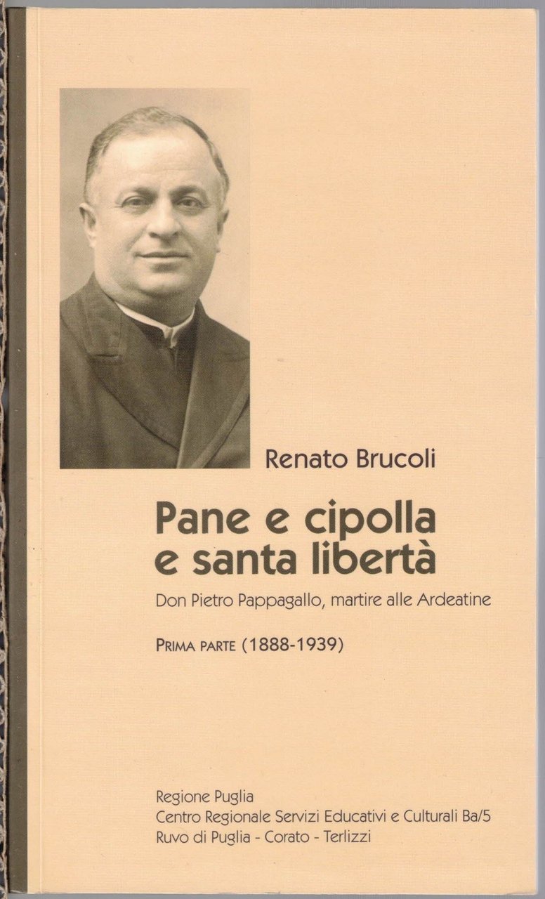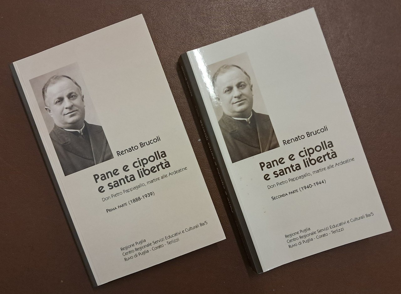 Renato Brucoli, Pane e cipolla e santa libertà. Don Pietro Pappagallo, martire alle Ardeatine, Regione Puglia – Centro Regionale Servizi Educativi e Culturali Ba/5 Ruvo di Puglia, Corato, Terlizzi, s.l. (ma stampato a Terlizzi, presso il Centro Stampa Litografica) 2007-2009, 2 voll., pp. totali 357, di cui 40 c. di tavv. ill. b.n. e col., cm 18, br. ed. Edizione fuori commercio. L’opera costituisce la biografia più completa esistente sulla figura di Don Pietro Pappagallo (1888-1944), sacerdote, antifascista e martire dell’eccidio delle Fosse Ardeatine (24 marzo 1944). Nelle tavole, oltre a una ricca documentazione fotografica, sono riprodotti anche alcuni documenti autografi di Don Pappagallo. Dettaglio dell’opera. Volume primo: 1888-1939, 2007, pp. 159, di cui 16 c. di tavv. ill. b.n. e col. Volume secondo: 1940-1944, 2009, pp. 198, di cui 24 c. di tavv. il. b.n. e col. Al secondo volume leggere tracce d’uso e alcune sporadiche sottolineature a lapis, per il resto perfetti. Ottimo insieme.