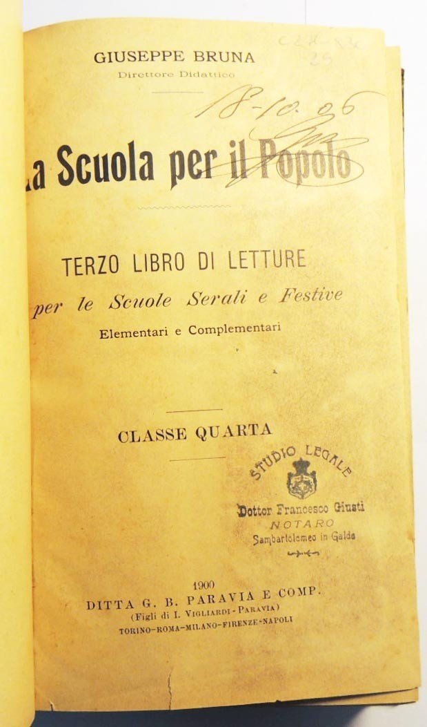 Giuseppe Bruna, La scuola per il popolo. Terzo libro di letture per le scuole serali e festive elementari e complementari. Classe quarta, Ditta G. B. Paravia e Comp., Torino 1900, pp. ill. b.n., 179, cm 19, mezza tela muta con tagli spruzzati. Legato con: Giuseppe Bruna, La scuola per il popolo. Libro di letture per le scuole serali e festive. Adottato come testo nelle Scuole Municipali di Torino. Classe quinta, Ditta G. B. Paravia e Comp., Torino 1900, pp. 227, ill. b.n. Timbro d’appartenenza con data e firma al frontespizio della prima opera, firma d’appartenenza e data all’interno del piatto posteriore, etichetta con segnatura di collocazione al dorso. Lievi tracce d’uso alla legatura che si presenta un po’ allentata, strappo all’ultima pagina di guardia, ma nel complesso esemplare ancora in buono stato di conservazione.