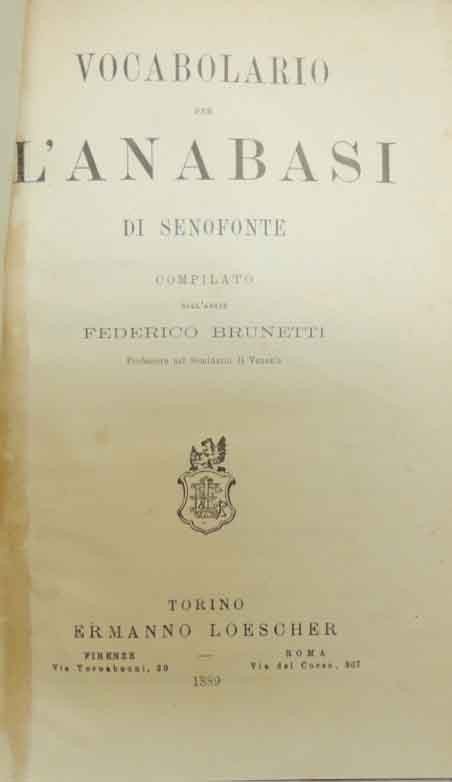 Vocabolario per l’Anabasi di Senofonte compilato dall’abate Federico Brunetti, Ermanno Loescher, Torino 1889, pp. VII, 156, testo su due colonne, cm 20, legatura in mezza tela con titolo al dorso. Segnatura di collocazione a una carta interna. Lievissime tracce d’uso alla legatura, minime fioriture, qualche carta con piccoli restauri, per il resto molto ben conservato.