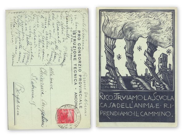 Bruno Da Osimo. (1888 – 1962). Incisore e scrittore italiano. Cartolina xilografica spedita e autografata.