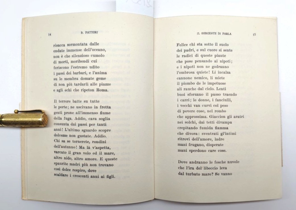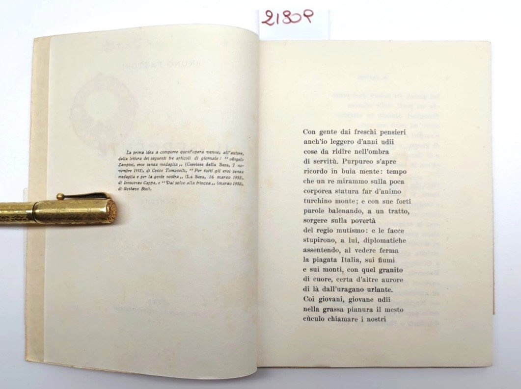 Legatura morbida editoriale con lievi sporcizie, fascetta editoriale priva dell'ala interna al margine anteriore, frontespizio con timbro ex libris e firma di possesso, interno in buono stato, alcune rare fioriture alle pagine interne, numero pagine 44 dimensioni cm 17,5 * 12,6