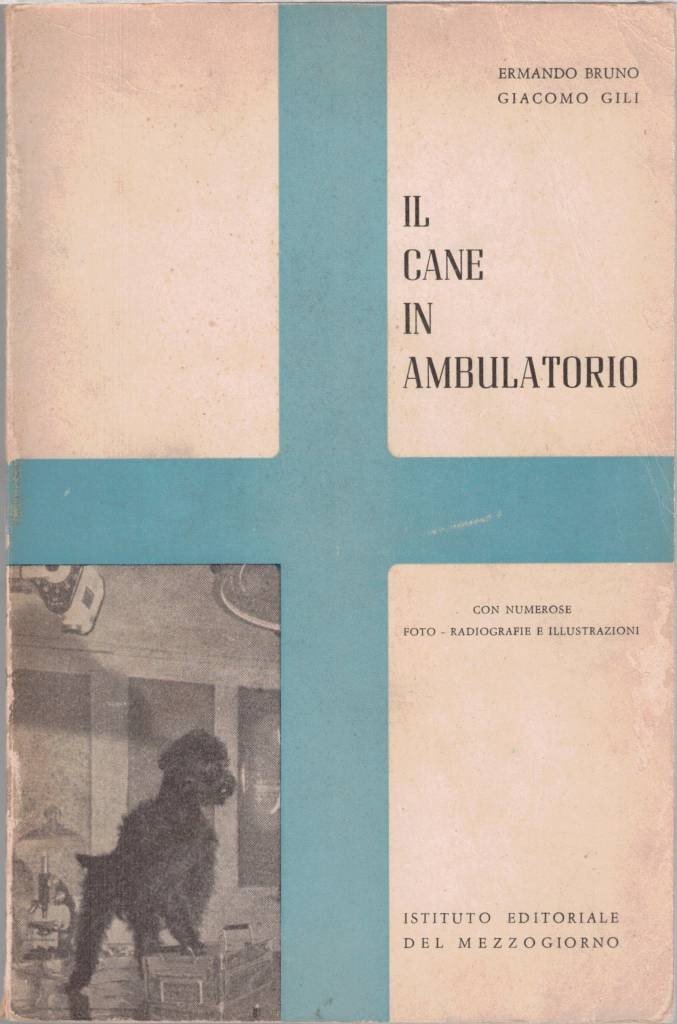 Ermando Bruno, Giacomo Gili, Il cane in ambulatorio. Con numerose foto, radiografie e illustrazioni, Istituto Editoriale del Mezzogiorno, Napoli 1965, prima ed., pp. 355, ill. b.n., cm 22, br. ed. Indice: La costituzione del corpo degli animali - Semiologia degli apparati - La riproduzione - Medicamenti - La malattia del cane - Malattie dell'apparato respiratorio - Malattie dell'apparato digerente - Malattie dell'apparato circolatorio - Malattie del sangue - Malattie dell'apparato urinario - Malattie dell'apparato genitale - Malattie del sistema nervoso - Malattie del ricambio - Malattie dell'apparato cutaneo - Malattie dell'occhio - Malattie dell'orecchio - Malattie dell'apparato locomotore - Malattie infettive - Malattie chirurgiche - Avvelenamenti - Morte rapida - Principi generali di alimentazione - Alimentazione del cane ammalato - Alimentazione del cucciolo. Tracce d'uso alla brossura, per il resto esemplare ben conservato. Rarissimo.