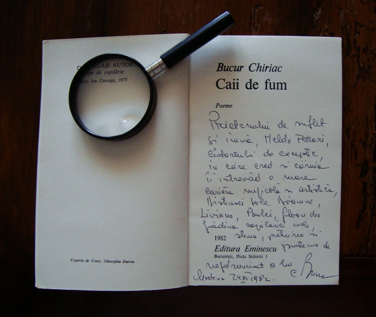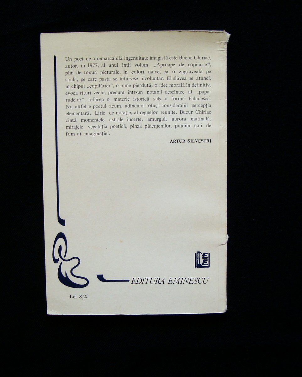 Bucur Chiriac, Caii de fum poeme Editura Eminescu, Bucarest, 1982, cm 19,5 x 12,5, pp.79, brossura ed.; lunga dedica autografa dell'autore al frontespizio(vedi foto) Condizioni di conservazione Esemplare in buone condizioni con leggere tracce d'uso e del tempo, brossure con minuscole macchiette; dorso con qualche abrasione e piccolo strappetto alla cuffia sup. OPEB.3434 BLU