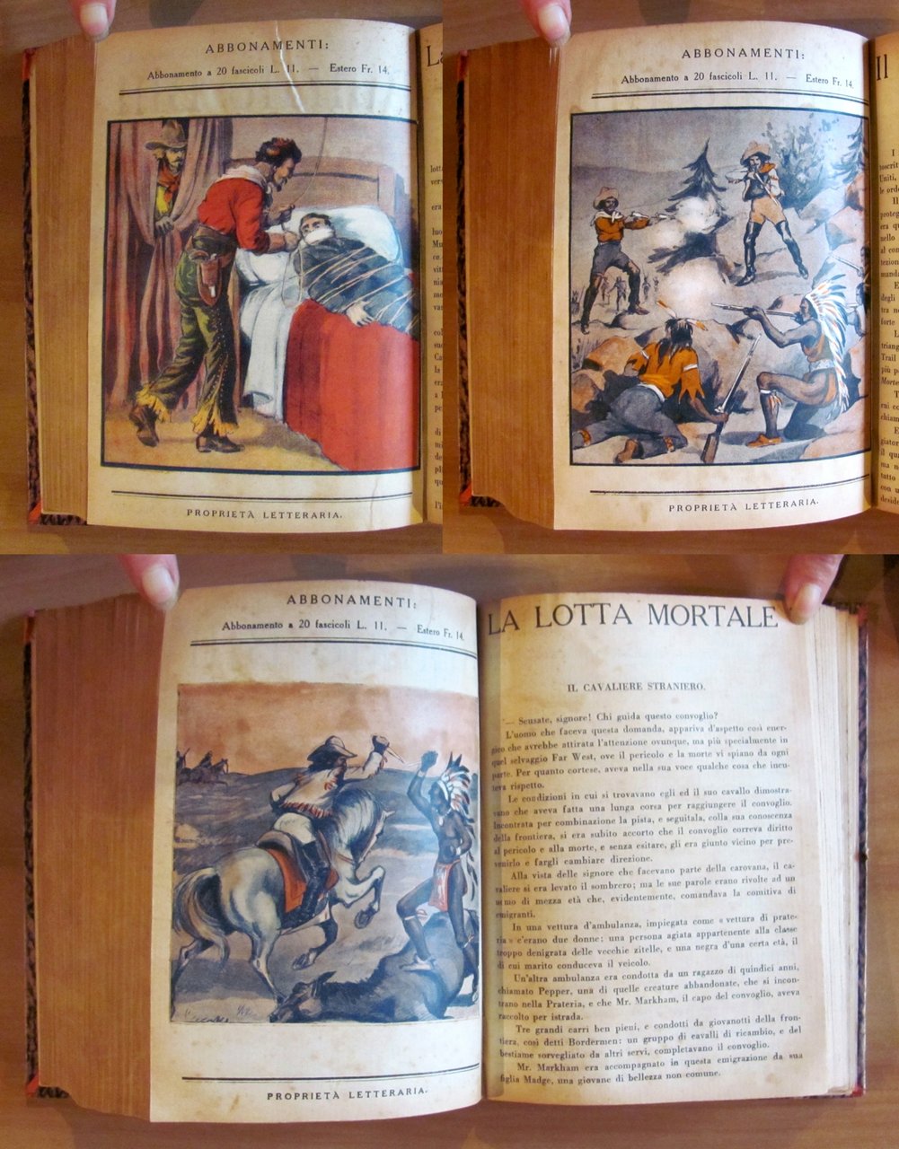 Memorie del Colonello W. F. Cody detto Buffalo Bill. Raccolta dei Fascicoli 1/30 - Completo. Belle copertine illustrate a colori da Natoli. Gloriosa - Casa Editrice Italiana - Milano, 1922. Rilegatura coeva con dorso in tela con titolo in oro. Particolare rilegatura nella quale le copertine originali non sono state inserite, come di norma, all'inizio di ogni fascicolo ma sono state presumibilmente ritagliate e incollate nel riquadro retrostante il frontespizio cosa che rende effettivamente molto fluente la lettura e la maneggiabilità del libro. 14x19,5; pag.32 in ciascun fasciolo. Molto Raro e in Buonissimo stato. , Molto buono (Very Good)