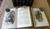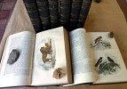 Ensemble en reliure uniforme de 8 forts volumes de format grand in 8°. Reliure en demi chagrin vert empire, titres dorés; impression sur deux colonnes. Buffon: Volume 1 et 2: Matières Générales et Théorie de La Terre, Minéraux; T.1; 1 frontispice-portrait, 782 pp., 5 cartes coloriées hors texte; T.II, 776 pp.; Volumes 3 et 4 Mammifères, T.1, 726 pp., 13 planches rehaussées; T.2, 784 pp., 29 planches rehaussées; Volumes 5 et 6 Oiseaux; T.I, 654 pp., 43 planches rehaussées; T.II, 730 pp., 26 planches aquarellées. Pour l'ouvrage de Lacépède; T.I, 668 pp., 22 planches rehaussées; T.II, 648 pp., 9 planches réhaussées. Au total un fontispice et 147 planches réhaussées à l'aquarelle sur papier fort et hors texte. Infime défaut à une coiffe du Lacépède. Sinon exemplaire en bel état avec les oeuvres de Lacépède jointes dans la même reliure. Quelques rousseurs quelques planches rousses mais ensemble très frais. Exemplaire désirable.