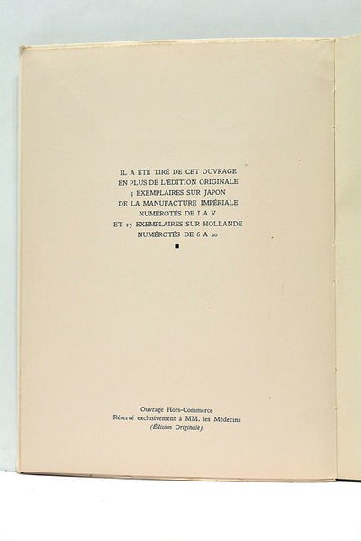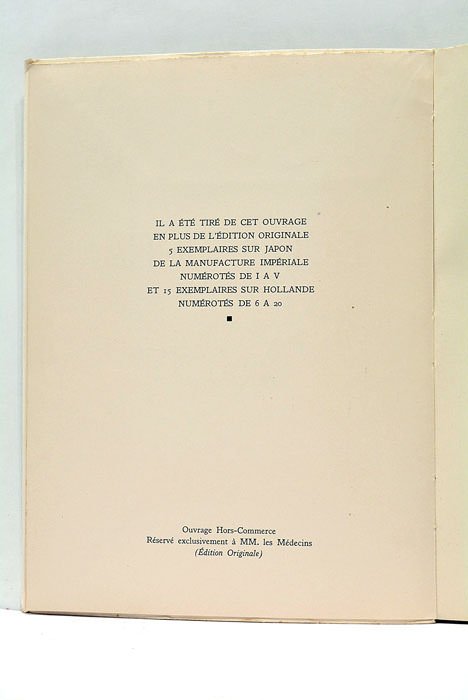 3 feuillets. 87pages. 1 feuillet. (25x19 cm). Couverture imprimée, rempliée. Edition Originale. Exemplaire hors-commerce réservé à MM. Les Médecins. Illustrée de huit dessins originaux de Louis Icart tirées en couleur et à pleine page.