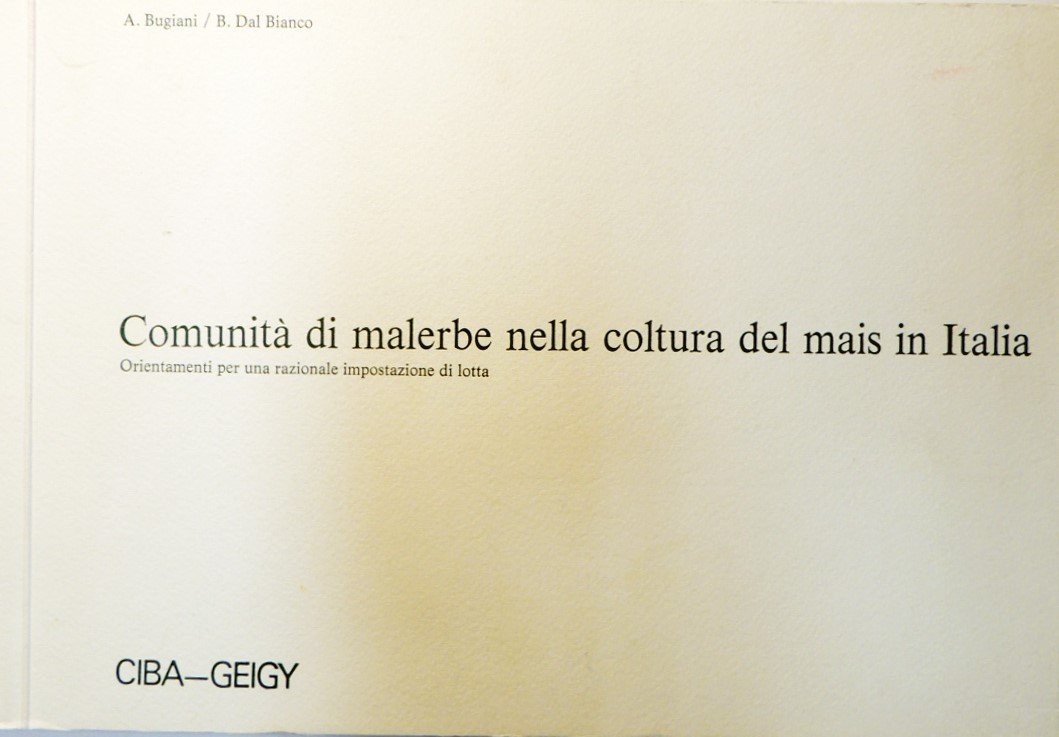 A. Bugiani, B. Dal Bianco, Comunità di malerbe nella coltura del mais in Italia. Orientamenti per una razionale impostazione di lotta, Ciba-Geigy, Milano 1971, pp. 85, ill. b.n., 10 c. di tavv. f.t. ill. col. e protette da fogli in acetato con didascalie, cm 21x32, br. ed. Comunicazione presentata al Convegno Nazionale su gli aspeti e problemi della Maiscoltura Italiana, Pisa 20, 21 e 22 settembre 1971. Indice: Introduzione – Metodologia – Schema sistematico della classe Stellarietea mediae secondo Braun-Blanquet e Tüxen – Rilievi floristici (Piemonte, Lombardia, Veneto, Friuli, Emilia Romagna, Toscana, Lazio e Campania) – Le specie infestanti dominanti nella coltura del mais – Considerazioni generali sull’evoluzione dell’assetto floristico – Sensibilità delle infestanti del mais ai diversi erbicidi e ad alcune loro possibili miscele, in relazione al periodo di impiego – Classificazione dei terreni in funzione della loro natura fisica – Orientamenti pratici per la scelta degli interventi di diserbo in funzione del tipo di terreno e delle coltivazioni che seguono, in rotazione, la coltura del mais – Nuove prospettive per la lotta contro le malerbe resistenti e la riduzione dei residui nel terreno. Perfetto.