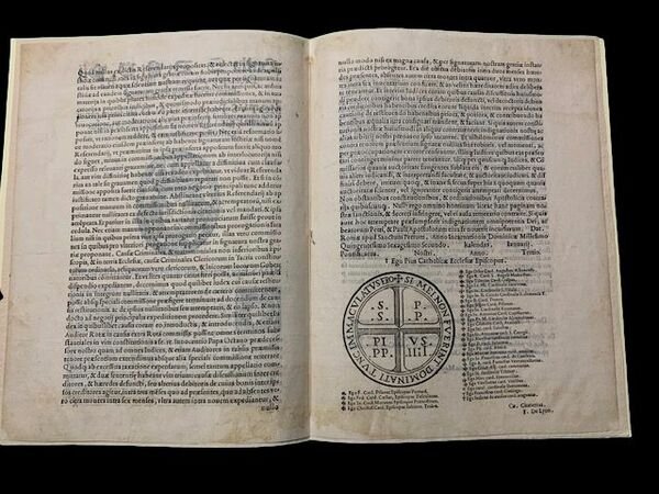 In 4° grande (32x21 cm); (4) pp. Legatura in cartoncino moderno. Due piccoli forellini alla prima carta, ininfluente. Qualche abile restauro ai margine interno basso ed alto con piccola integrazione di carta bianca. Quasi invisibile e per il resto esemplare in buone condizioni di conservazione. Stemma mediceo, di Pio IV, alla prima pagina. Rara bolla papale di Papa Pio IV, nato Giovanni Angelo Medici di Marignano (Milano, 31 marzo 1499 Roma, 9 dicembre 1565), al quale si deve la conclusione del Concilio di Trento e che fra i vari incarichi, ricoprì, nel 1542-1543, la posizione di commissario delle truppe pontificie inviate in Ungheria e Polonia contro Turchi e luterani. Importante bolla papale con la quale il pontefice riforma l'amministrazione parte dell'amministrazione della giustizia pontificia. Il pontefice agevolò anche l'arte della stampa istituendo nel 1561 la Stamperia del popolo romano, chiamandola a dirigerla Paolo Manuzio, figlio terzogenito di Aldo (Bulla Motu proprio del 22 luglio 1561). Importante e rara bolla pontifica di interesse giuridico romano. Esemplare in buone condizioni di conservazione. Rif. Bibl.: PUVE015813 EDIT16/CNCE041969.