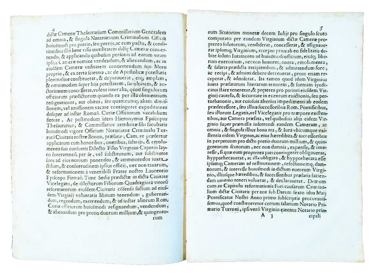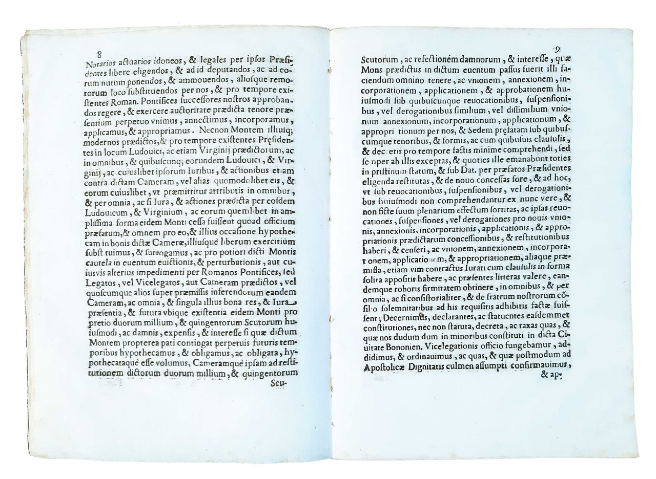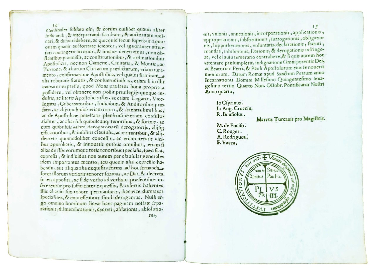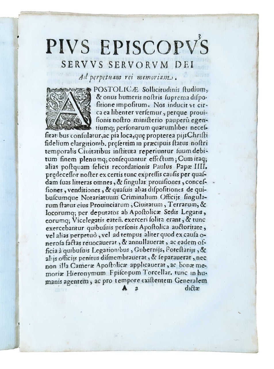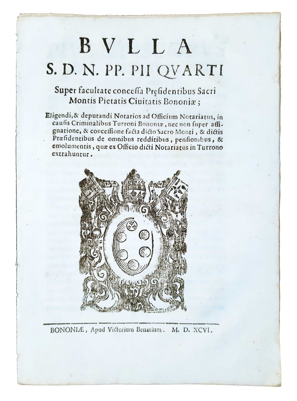 in-4°, 204x144 mm, fascicoli slegati; pp. 15, [1]. Stemma di papa Pio IV sul frontespizio. Iniziale xil. Finale xilografico alla fine del testo. Bianca l'ultima carta. Data di emanazione alla fine: Roma, 4 ottobre 1563, anno quarto del pontificato di Pio IV. Bolla pontificia sulla facoltà concessa ai presidenti del Sacro Monte di Pietà di Bologna di eleggere e nominare i notai nelle cause criminali del Turron di Bologna, nonché sui redditi e le pensioni derivanti a tali notai da detto incarico. Riferimenti: Z. Zanardi, Bononia manifesta, n. 2736 (Catalogo dei bandi e manifesti di Bologna). Rif.: IT\ICCU\UBOE\015326. CNCE 53471. OCLC, 1002735428. Cond.: Esemplare molto buono.