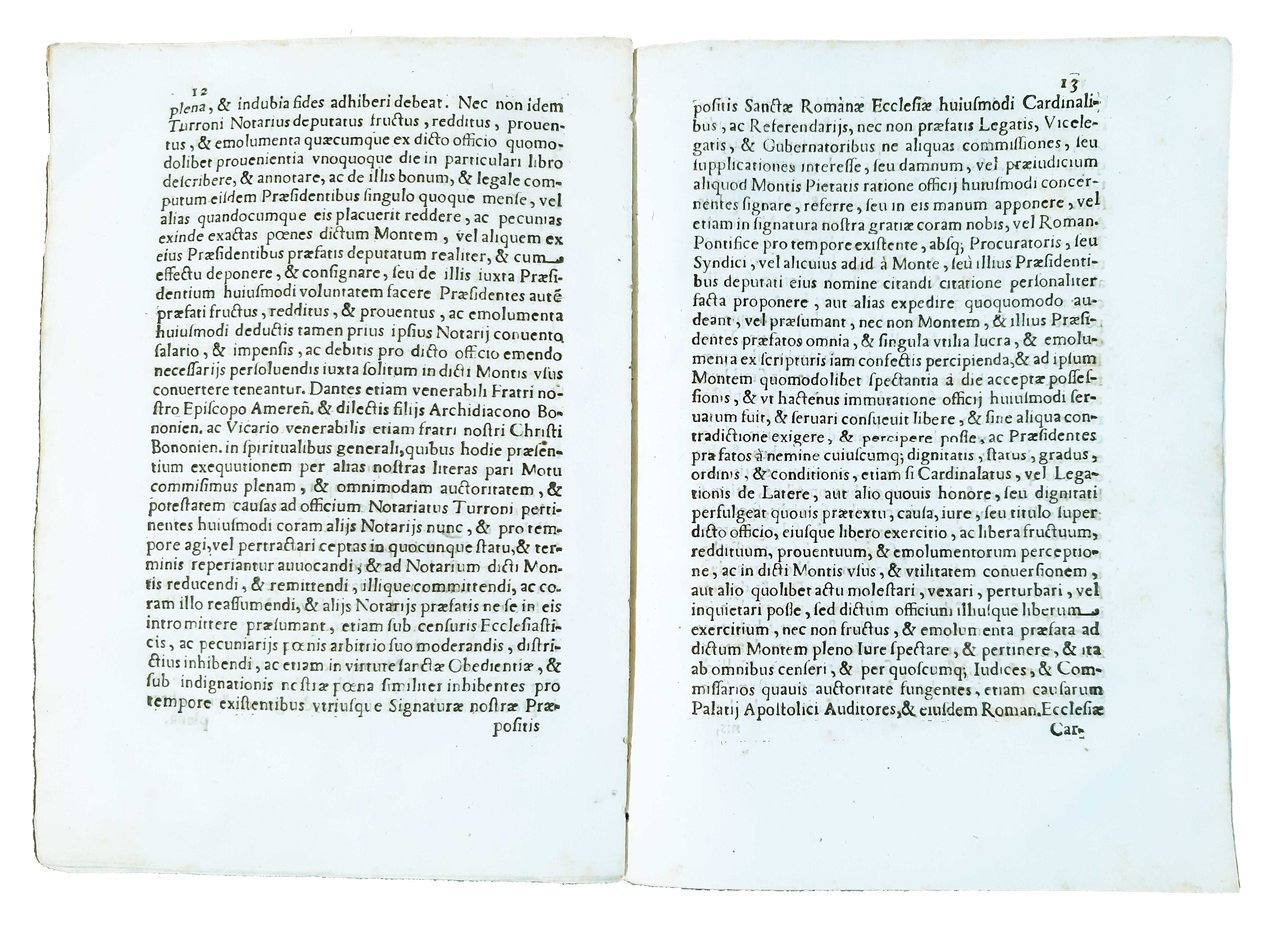 Bulla S.D.N. PP. Pii Quarti super facultate concessa presidentibus Sacri Montis Pietatis civitatis Bononiae, eligendi, & deputandi notarios ad omnium notariatus, in causis criminalibus Turroni Bononiae, nec non super assignatione, & concessione facta dicto sacro Monti, & dictis presidentibus de omnibus redditibus pensionibus, & emolumentis, que ex officio dicti notariatus in Turrono extrahuntur.