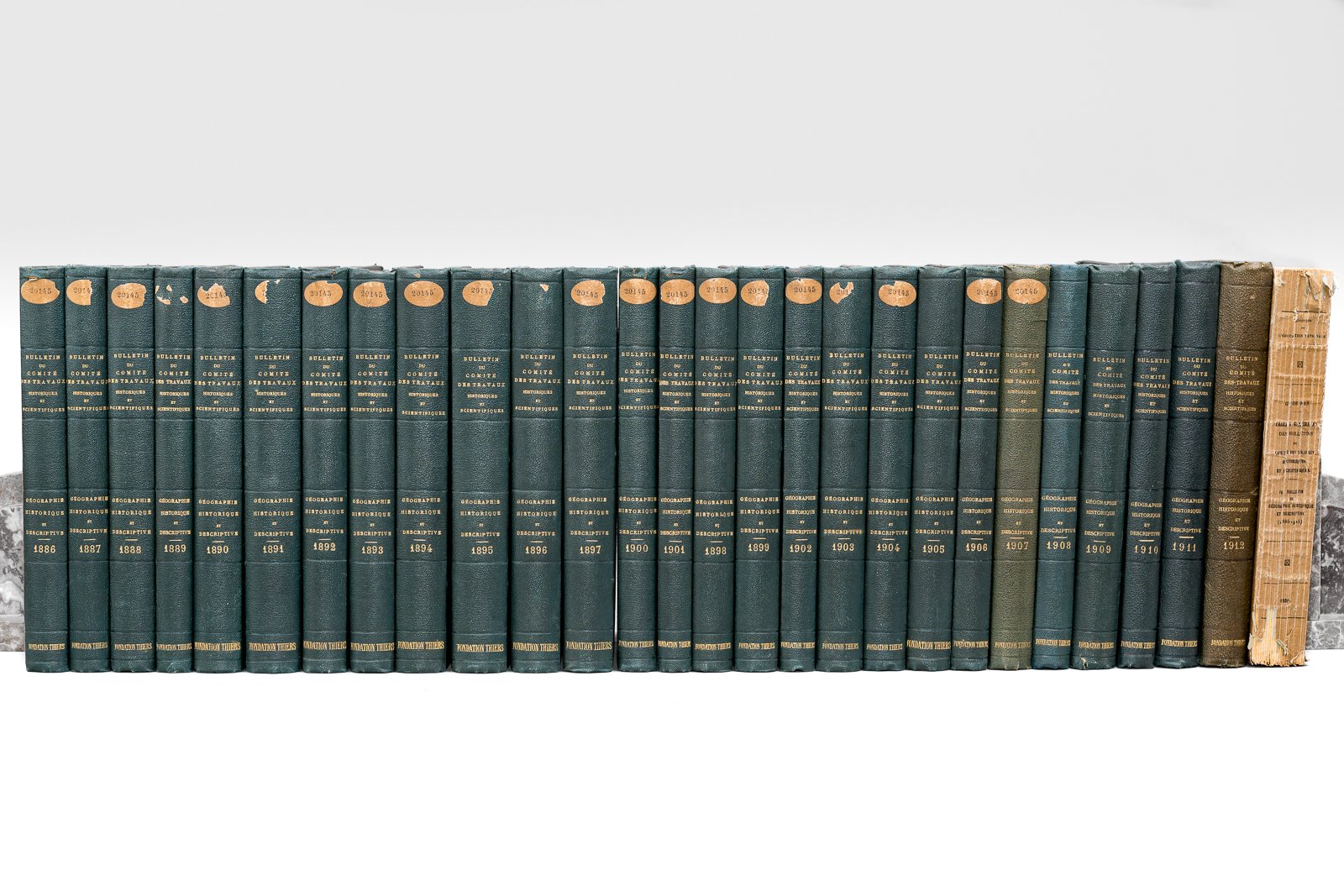 27 vol. in-8 cartonnage pleine percaline vert, nom de la "Fondation Thiers" au dos en queue, Ministère de l'Instruction Publique et des Beaux-Arts, Comité des Travaux historiques et scientifiques, Ernest Leroux éditeur, puis Imprimerie Nationale, Année 1886, 382 pp. et 11 planches hors texte (dont cartes ethnographiques en couleurs de la Tunisie), parfois dépliantes ; 1887, 350 pp. et 11 planches hors texte, parfois dépliantes (dont nombreuses illustrant les "Principes de la Fortification antique depuis les temps préhistoriques jusqu'au Croisades", par le Lieutenant-Colonel G. de La Noë) ; 1888, 448 pp. 9 planches hors texte, parfois dépliantes (dont Oppidum du Mont-Beuvray par Bulliot, Densité de la Population dans le SE de la France, en couleurs, par Victor Turquan, Péninsule Malaise en couleurs, etc.) ; 1889, 334 pp. et 9 planches hors texte, souvent dépliantes (dont Embouchure la Loire, Saint-Nazaire, Kairouan, Fortifications romaines, etc.) ; 1890, 487 pp. et 6 planches hors texte, parfois dépliantes (dont Carte de l'Ile Formose au XVIIIe siècle, Carte de la Province de Touraine en 1766 par Chauvigné, Carte en couleurs du Tonkin, avec "Pays Montagneux inexploré occupé par les Pirates", "Carte du Pays des Mans-Tiens" par le Lieutenant Massy, Itinéraire de Catat et Maistre à Madagascar, etc.) ; 1891, 526 pp. et 12 planches hors texte, parfois dépliantes (dont "Le Darvaz et le Karatéguine", Carte des connaissances géographiques des Portugais en Indonésie vers 1519, Carte en couleurs du Véron (Touraine) avant 1789 par Chauvigné, Cartes anthropologiques en couleurs de la Khoumirie, etc.) ; 1892, 441 pp. et 7 planches hors texte, parfois dépliantes (dont Carte du Territoire de Hami, Extraite du K'in-ting Sin-Kiang tche-lio (Livre III), Carte de la Région du Thé d'après les itinéraires de la Mission Pavie, etc.) ; 1893, 449 pp. et 14 planches hors texte, parfois dépliantes (dont Nho-Quanphanphudo Région de Hoa-Lu dressée par G. Dumoutier, etc.) ; 1894, 464 pp. et 6 planches hors texte, parfois dépliantes (dont Detailed hydrographic and topographic Chart of the Itasca State Park by Browser, Itinéraires en Mongolie orientale par Bretschneider, Carte de la Brenne avant 1789 par Chauvigné, Copie d'une carte manuscrite de la Guiane dresée par les Jésuites en 1741 communiquée par M. Buache en 1787, Esquisse inédite de la Guyane par M. Buache, etc.) ; 1895, 499 pp. et 12 planches hors texte, parfois dépliantes (dont Itinéraire de Fes à Oudjda suive an 1891 par H. de La Martinière, Carte chinoise du Si-Yu ou Asie Centrale pour accompagner le Mémoire intitulé Récit officiel de la Conquête du Turkestan par les Chinois 1758-1760, Carte de Pho-Hien, Plan de la Forêt d'Arties au XVe siècle, etc.) ; 1896, 415 pp. et 25 planches hors texte, parfois dépliantes (dont fac-similé complet d'un Portulan annamite du XVe siècle par G. Dumoutier, en 24 cartes) ; 1897, 519-11 pp. et 8 planches hors texte, parfois dépliantes (dont Ile de Cayenne et ses environs d'après Bellin, Mappemonde Syriaque, Somal Harrar et Pays Gallas par Alfred Bardey, Carte du Territoire russe administré par la Chine, Itinéraire dans le Quang-Binh au Nord de Dong-Hoï, etc.) ; 1898, 420 pp. et 6 planches hors texte, parfois dépliantes (dont Carcasses flottantes de 1866 à 1893, Itinéraire dans le Quang-Binh au Nord de Dong-Hoï, Itinéraire dans le Quang-Tri, etc.) ; 1899, 505 pp. et 1 grande carte dépliante (El-Yemen et Partie de l'Hadramaut Arabie Méridionale dressés par Alfred Bardey.) ; 1900, 369 pp. et 2 planches dépliantes ; 1901, 423 pp. et planches dans le texte ; 1902, 423 pp. et planches dans le texte ; 1903, 539 pp. et 5 planches hors texte, dont une dépliante ; 1904, 491 pp. et 5 planches hors texte dont une dépliante ; 1905, 496 pp. et 6 planches hors texte, parfois dépliantes ou doubles (dont Schéma des Principales Migrations au Congo Français, etc.) ; 1906, 432 pp. et 3 planches hors texte (dont Distribution géographique des Races sur la Côte occidentale d'Afrique, de la Gambie à la Mellacorée) ; 1907, 497 pp. avec 1 planche dans le texte et 4 planches hors texte, parfois dépliantes ; 1908, 452 pp. avec 3 cartes sur une planche dépliante ; 1909, 420 pp. et 23 planches hors texte (dont reproduction d'un "Atlas inconnu de la dernière expédition de Drake, vues prises de son bord) ; 1910, 446 pp. et 3 planches hors texte ; 1911, 462 pp. avec 6 planches hors texte (dont mappemonde de Ripoll) ; 1912, 520 pp. avec 4 et 22 planches hors texte Exceptionnelle série en reliure uniforme, parfaitement complète des 27 années de publication du "Bulletin de Géographie Historique et Descriptive". Cet ensemble d'un intérêt historique remarquable nous fait voyager dans le monde entier, et est illustré de très nombreuses cartes et planches hors texte. A partir de 1913, il deviendra "Bulletin de la Section de Géographie". Bon ensemble (gommette de cote en dos et anciens cachets de la Fondation Thiers, qq. rare frott. ou accrocs en coiffe sup., bon exemplaire par ailleurs) auquel on joint les indispensables "Tables Générales" pour les années 1886 à 1915 (volume broché avec frott. et mq. en dos)