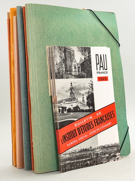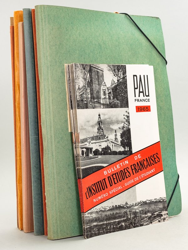 Rappel du titre complet : Bulletin de l'Institut d'Etudes Françaises pour Etrangers. Pau. Session de 1965 [ 6 Dossiers et 1 Brochure : Bulletin de l'Institut d'Etudes Françaises. Numéro Spécial. Guide de l'Etudiant ] Dossier I : Etudes Régionales : La Ville de Pau son Histoire - Les Bastides et "Villeneuves" en Béarn - Les Chemins de Saint-Jacques en Béarn - Dossier II Cours Normaux Degré Supérieur : Choix de Textes Français - Dossier III Cours Normaux Degré Moyen : Choix de Textes Français - Dossier IV Stages. Choix de Textes Français - Dossier V Cours Normaux Degré Moyen. Choix de Textes Français - Dossier VI Première Demi-Session. Choix de Textes Français. Poésie. Roman. Théâtre. Doctrines. Moralistes. Civilisation. Très intéressant et important dossier, provenant de la bibliothèque de Jean Mesnard, qui fut alors directeur adjoint de la formation (pour l'année 1965), avant de devenir professeur à La Sorbonne, quelques années plus tard. Superbe état. La brochure donne tout le détail des sessions.