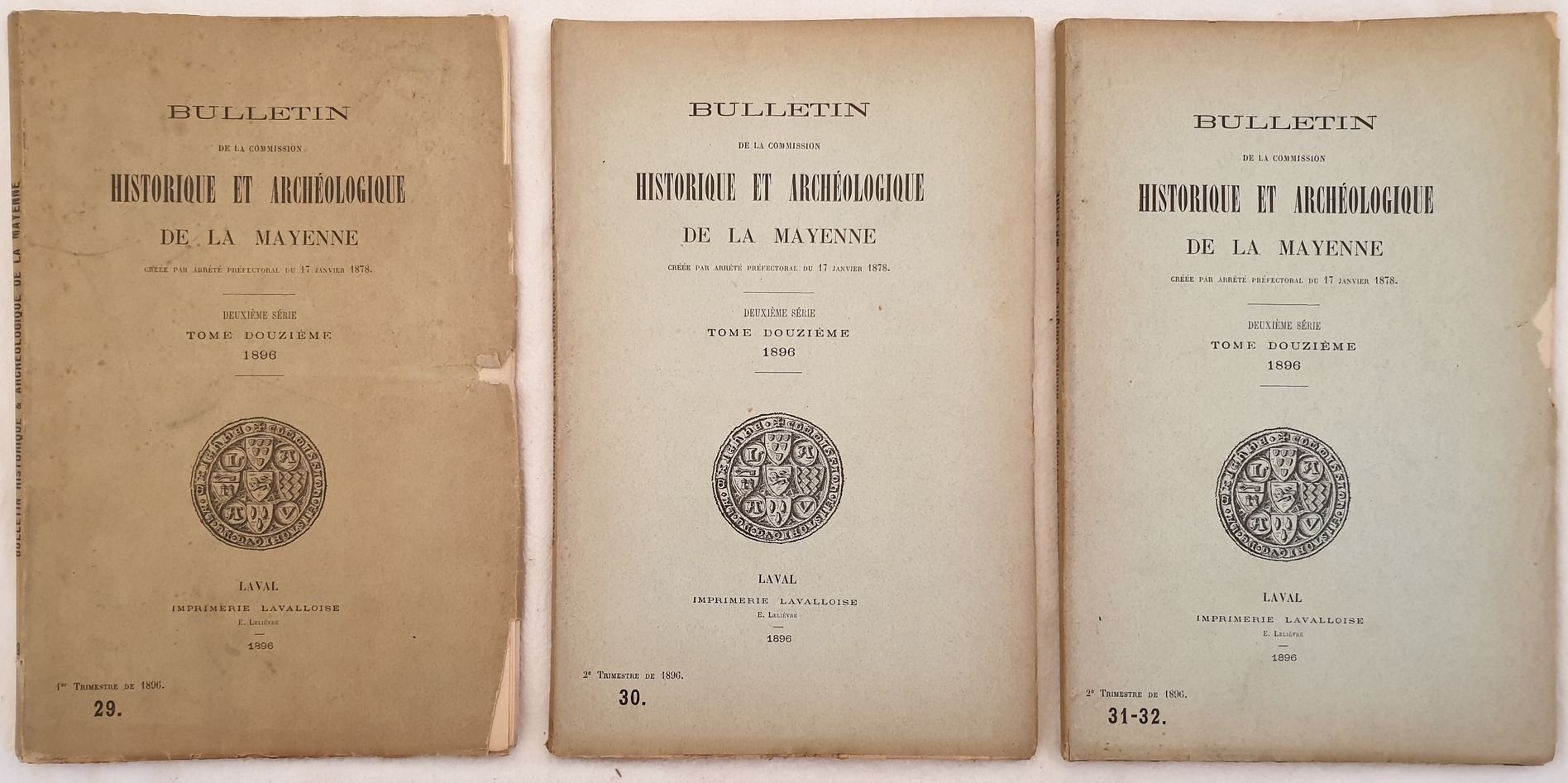 Annata completa del 1896 della rivista di storia e archeologia "Bulletin de la commission historique et archeologique de la Mayenne". Siamo in possesso di tre fascicoli ed è completa. Alcune illustrazioni in bianco e nero all'interno. Gli argomenti trattati: La corporazione dei boulangers a Laval, La Maison di Laval, Una carta falsa del priore d'Avesnieres, Corporazione a Laval, I Signori di Couceriers, La Porta a Laval, Tesoro di Beraumont Pid de Boeuf, Un soldato cattolico della battaglia di Craon, Sepoltura di Entrammes, Elezione di un Presidente e di un segretario generale ecc. In buone condizioni. Coperta editoriale in buone condizioni generali con lievi usure ai margini e dorso. Legatura in buone condizioni. All'interno le pagine si presentano in ottime condizioni con rare fioriture, ancora da rifilare. In 8. Dim. 25,5x16,5 cm. Pp. 410. Complete year collection of 1896 of the magazine of history and archeology "Bulletin de la commission historique et archeologique de la Mayenne". We only have the three pamphlets and is complete. Some black and white illustrations inside. Between the issues treated: Corporations of boulangers in Laval, Maison of Laval, A false paper of Avesnieres, Corporation of Laval, The lords of Couceriers, The door of Laval, Treasure of Beraumont Pid de Boeuf, A catholic soldier of the battle of Craon, Buring of Entrammes, Election of a President and a genral segretary ecc. In good conditions. Editorial cover in good conditions slightly worn in the edges and spine. Binding in good conditions. Pages in very good conditions with occasional foxings, stil to be bound. In 8. Dim. 25,5x16,5 cm. Pp. 410