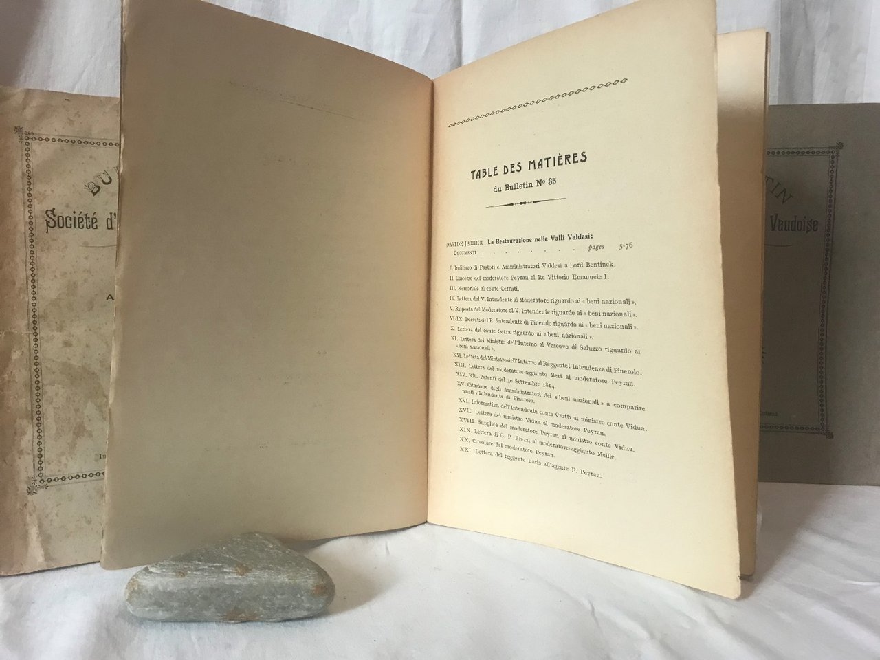 Tre volumi in 8, brossura editoriale (mende e piccole mancanze), titolo ai piatti, frontespizi, 68, 124, 115 pp. Tre numeri del ricchissimo bollettino della Comunit Valdese con una miriade di saggi sulla storia e sulla vita del Protestantesimo in Piemonte. Assai rari a reperirsi, sono presentati in pi che bello stato fatte salve le pecche alle brossure. Notevoli