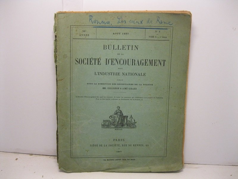 Bulletin de la Societe' d'encouragement pour l'industrie nationale publie' sous la direction des secretaires de la Societe' Mm. Collignon & Aime' Girard. Aout 1897, no 8, tome II, 5 serie: Les transport par cables ae'riens; Les eaux de Rome, Sources, aqueducs, fontaines; Revue des ameliorations apporte'es a la production agricole pendant l'anne'e 1895-1896