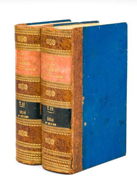 2vol. fort et petit in-8 reliure de l'époque demi-basane blonde, Imprimerie Impériale, Paris, Bulletin des Lois de l'Empire Français. XIe Série. Règne de Napoléon III, Empereur des Français. (Tomes 11 et 12 : Année 1858) Partie Supplémentaire contenant les décrets et arrêtés d'intérêt local ou particulier [ Contient : ] Tome 11 : 1er semestre 1858 n° 452 à 503 ; Tome 12 : 2e semestre 1858 Bon ensemble réunissant les 2 tomes de l'année 1858 pour la partie supplémentaire du "Bulletin des Lois" contenant les décrets et arrêtés d'intérêt local ou particulier. Etat très satisfaisant (petits accrocs en coiffes et mors, bon état par ailleurs)