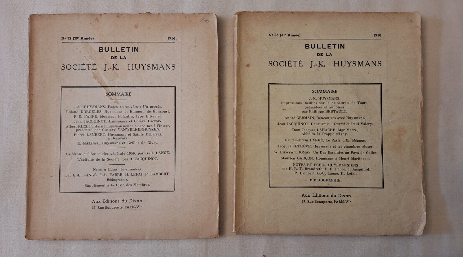 BULLETTIN DE LA SOCIETE' J.K. HUYSMANS N. 32 1956 - N. 35 1958 ED. DU DIVANIn 8°, 2 numeri, legatura editoriale, copertina illustrata, ill. in b/n.In ottime condizioni, lievissimi segni alla copertina.