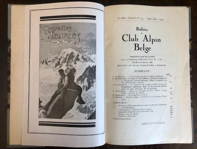 Sept. - Déc., 1934. 3° série. Tome I, nn. 3 – 4. In 8vo, pp. 177, con una carta rip. della Silvretta e numerose ill. in b/n f. t. virate al seppia (anche relative all'alpinismo su roccia e alle vie di rampicata), buona leg. coeva in cartonato marmorizz. con dorso e punte in tela grigia, titolo in oro al dorso. Molto buono. .