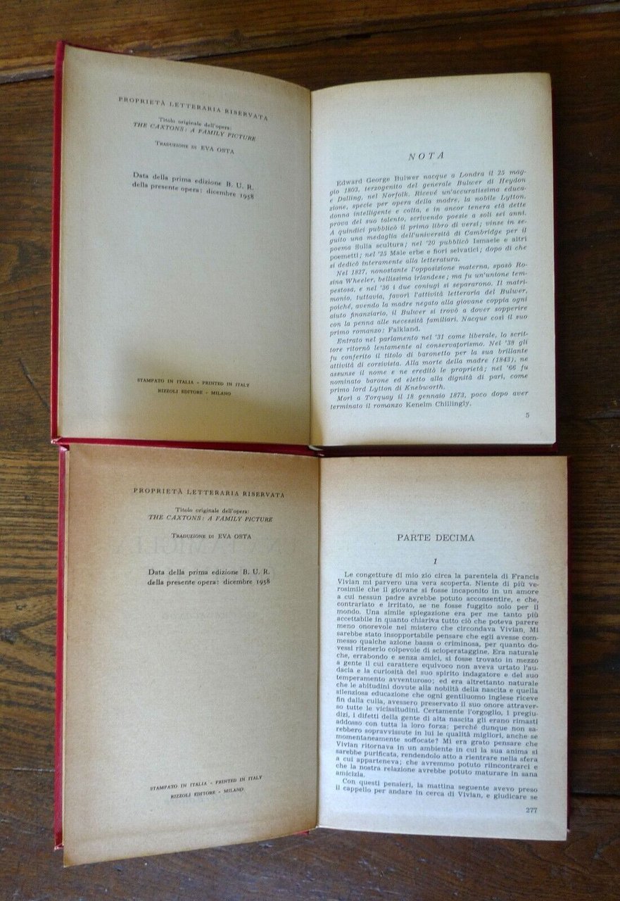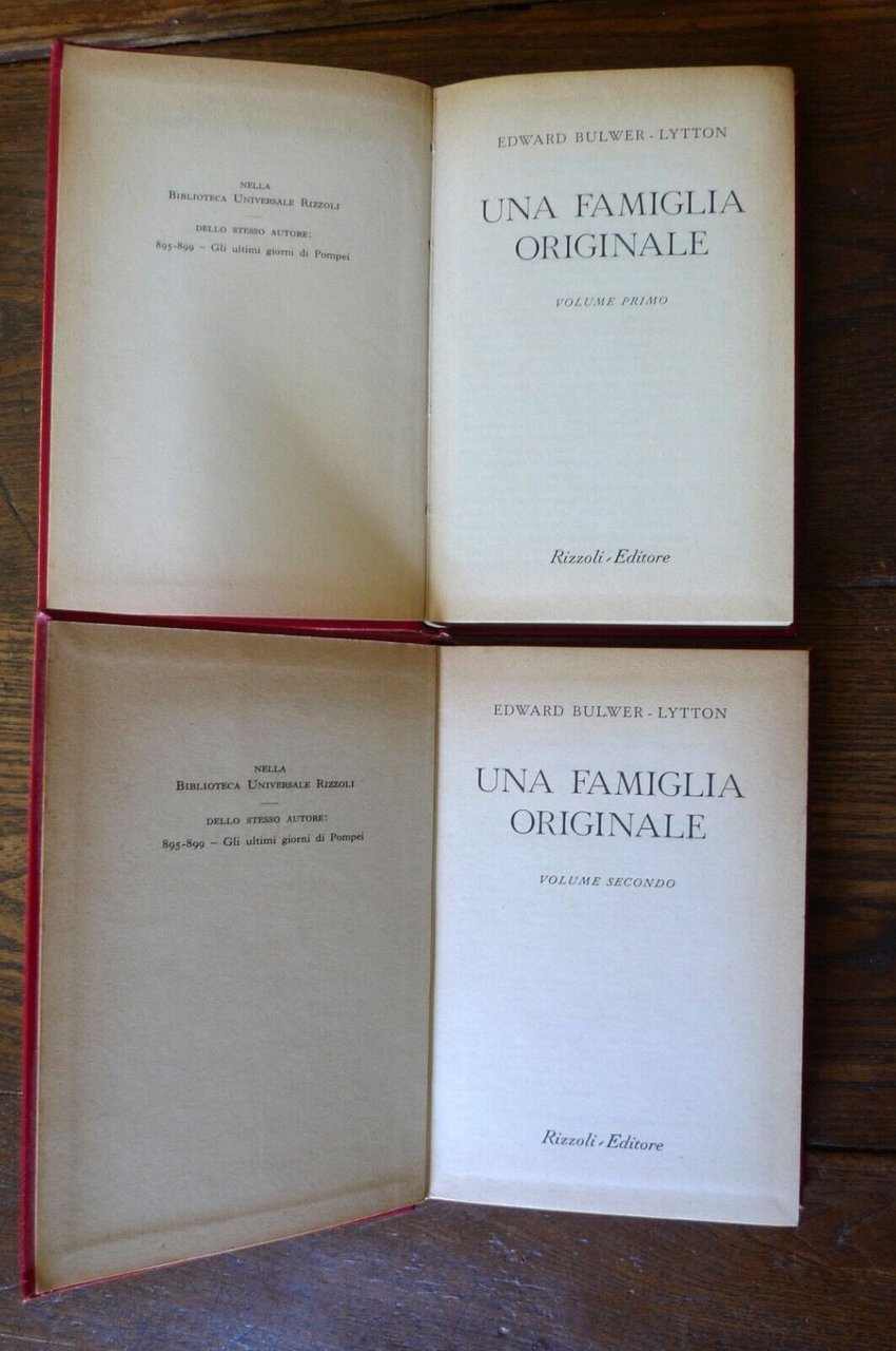 Edward Bulwer-Lytton,UNA FAMIGLIA ORIGINALE.VOLUME PRIMOVOLUME SECONDO[2 VOLUMI, OPERA COMPLETA]Rizzoli editore, 1958,prima edizione BUR: dicembre 1958,copertina rigida, rilegatura in similpelle,16x10,5 cm., pp.565,titolo originale dell'opera:The Caxtons: a Family Picture,traduzione di Eva Osta,collana BUR Biblioteca Universale Rizzoli n.1377-1379; 1380-1382,peso: g.500