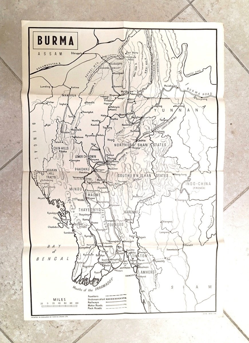 [G.P.D. 344/26 3/45] Grande mappa stradale e ferroviaria in bianco e nero della Birmania (Myanmar); scala approssimativamente 1 : 2,200,000. Dimensioni 50,5 x 76 cm circa. Ripiegata. In ottimo stato.