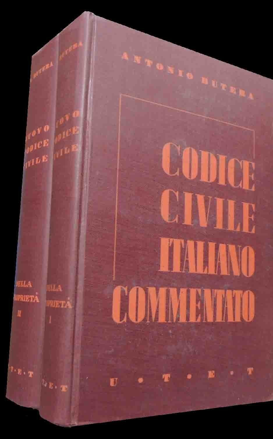 Antonio Butera, Il codice civile italiano commentato secondo l’ordine degli articoli (R.D. 30 gennaio 1941, n. 15). Libro della proprietà, Unione Tipografico-Editrice Torinese, Torino 1941, 2 voll., pp. 1139, cm 25, legatura in tutta tela ed. con titoli al dorso e al piatto. Vol. I: Parte prima. Dei beni, delle proprietà, della superficie, dell’enfiteusi, dell’usufrutto, dell’uso e dell’abitazione, pp. 539. Vol. II: Parte seconda. Delle servitù prediali, della comunione, del possesso, della denuncia di nuova opera e di danno temuto, pp. 654. Qualche sporadica sottolineatura e rari segnetti di pastello ai margini, al secondo volume una carta con uno strappo senza mancanze, per il resto minime fioriture ai tagli, leggera brunitura della carta, ma volumi complessivamente molto ben conservati e solidamente legati.