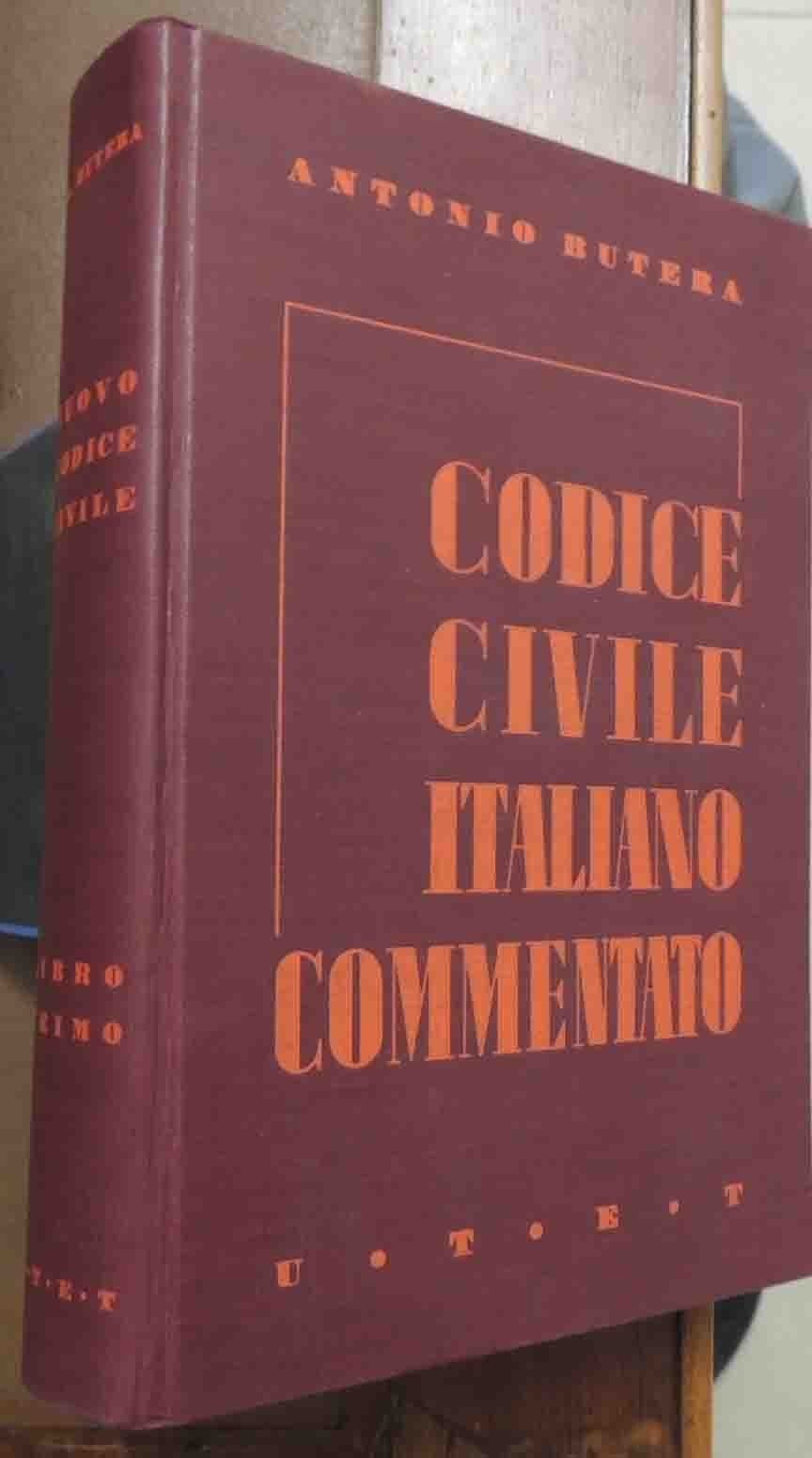 Antonio Butera, Il codice civile italiano commentato secondo l’ordine degli articoli (R.D. 12 dicembre 1938-XVII, n. 1852). Libro primo, Unione Tipografico-Editrice Torinese, Torino 1939, pp. IV, 576, legatura in tutta tela ed. con titoli al dorso e al piatto. Minime fioriture al taglio superiore, leggera brunitura della carta, per il resto perfetto.