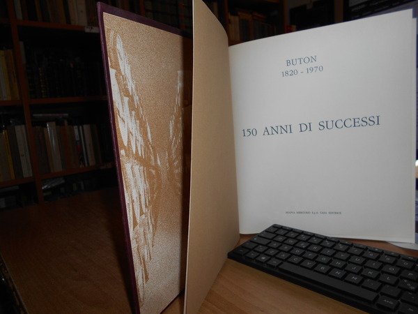 Buton 1820 - 1970. 150 anni di successi. Cremona, Casa Editrice Nuova Mercurio, 1970. In-4° quadrato, tela bordeaux con titolo in oro al dorso, illustrazione dorata sul piano anteriore. Pagine non numerate con numerose illustrazioni la maggior parte a colori. Normali segni del tempo. Neg. mob. 21 in basso.