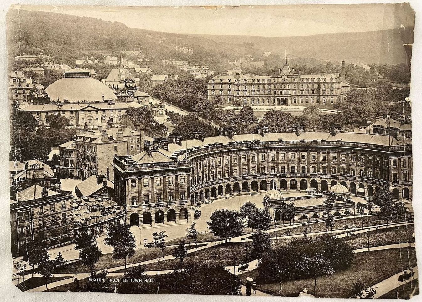 Fotografia di fine ottocento, la veduta di Buxton (Derbyshire) dal Town Hall. Usure e strappi marginali. Dim. Foto cm 37,5x27. Photo of late 19th century, the view of Buxton (Derbyshire) from Town Hall. Wearings and tears in the extremities. Dim. Foto cm 37,5x27