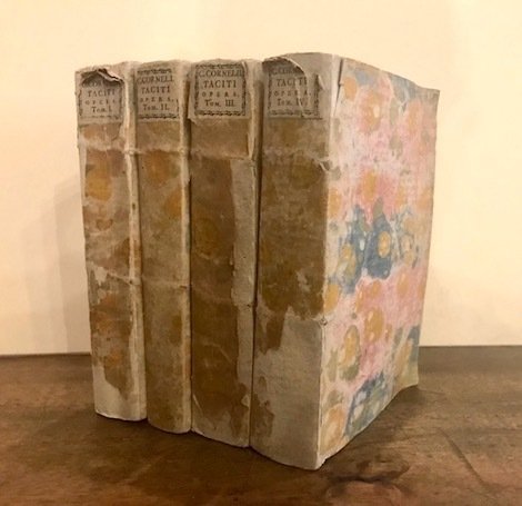 8vo (cm. 18,7), 4 Voll., XLIII-392 pp. con antiporta allegorica incisa su rame da Innocente Alessandri; 344 pp. con una tav. ripiegata f.t.; 424 pp.; 174 pp., 1 c.nn., 246 pp., 1 c.nn. bianca. Frontespizio calcografico in ciascun volume. Legature coeve in cartonato marmorizzato con titolo a stampa su tassello cartaceo al ds. (lievi tracce d’uso e alcune abrasioni ai dorsi). Freschissimi interni in barbe. Bella edizione dell’opera di Tacito nitidamente impressa.