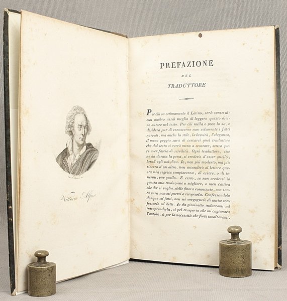 In-8° grande; ritratti di Sallustio e dell'Alfieri, 188 pp.; legatura coeva in mezza pelle. Bell'esemplare lievemente fiorito. Edizione non comune, stampata a Firenze, non citata dal Bustico.