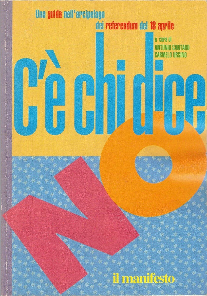 C’è chi dice no, a cura di Antonio Cantaro e Carmelo Ursino, il manifesto, s.l. 1993, pp. 79, cm 20, br. ed. In testa alla prima di copertina: Una guida all’arcipelago dei referendum del 18 aprile. Opuscolo informativo sui referendum dell’aprile 1993. Indice: Stefano Menichini, Introduzione – A. Cantaro, In viaggio verso il 18 aprile – A. Cantaro, C. Vedovati, Per non dimenticare: un po’ di storia politica e elettorale – C. Ursino, I referendum sul Senato: maggioritaria alla Segni – S. Anastasia, Un sì al referendum sulle droghe: il massimo bene e il minor male – D. La Rocca, Gli altri referendum – C. Ursino, Le riforme elettorali dalla A alla Z. Lievi tracce d’uso, per il resto perfetto.