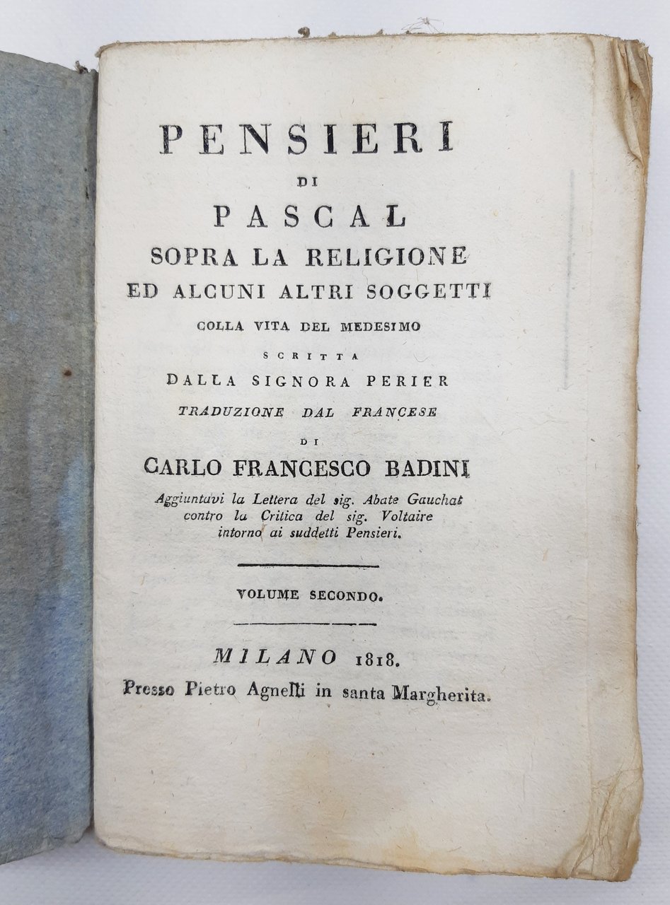 C. F. Badini Pensieri di Pascal sopra la religione ed alcuni altri soggetti Milano 1818 3 vol