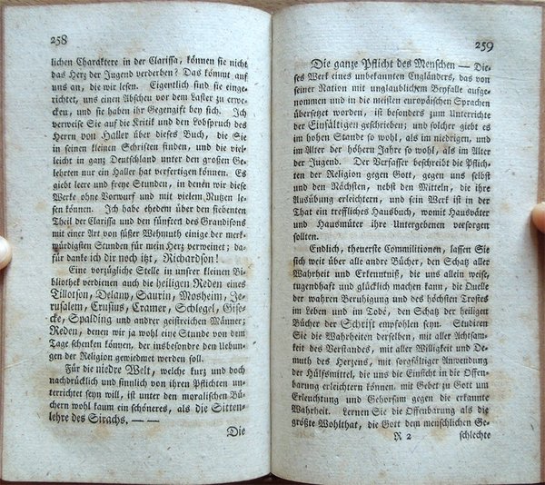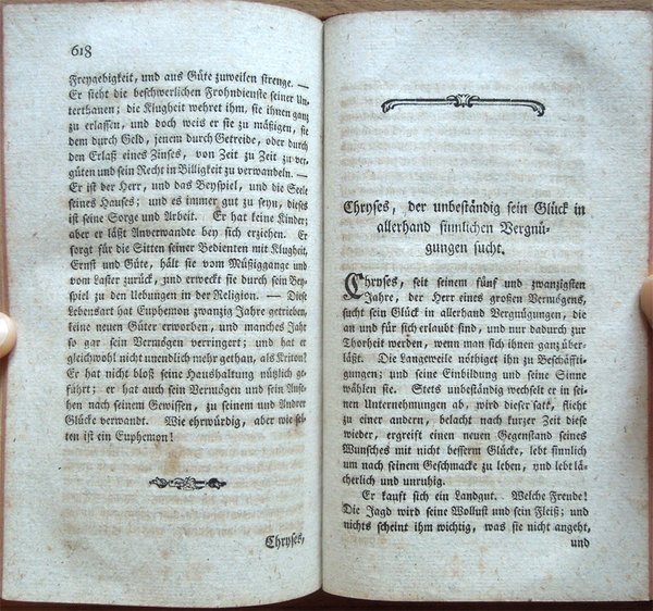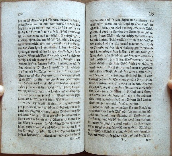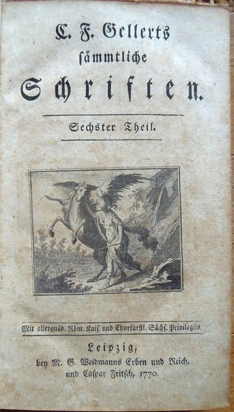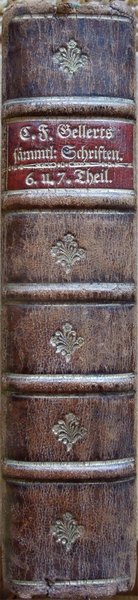 Due tomi in un volume in-16° (16,8 x 10 cm) pp. (2), XXXVI, 368; (6), 369-666, legatura coeva in piena pelle con titoli in oro su tassello e fregi in oro al dorso a sei scomparti. Normali tracce del tempo alla legatura, in particolare al dorso. Tagli rossi. Frontespizi con vignette incise. Doppie carte di guardia. Firme d'appartenenza di stessa mano coeva al recto della seconda carta di guardia anteriore. Normale patina del tempo alle pagine, con lievi arrossature dovute al tipo di carta, per il resto, ben conservato. Sechster und Siebenter Theil dell'opera GELLERT Christian Fürchtegott, C. F. Gellerts sämmtliche Schriften, Leipzig, bey M. G. Weidmanns Erben und Reich, und Gaspar Fritsch, 1769-1774.