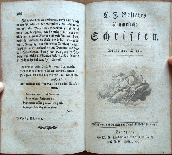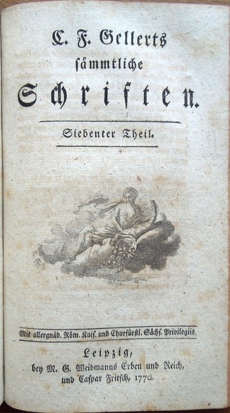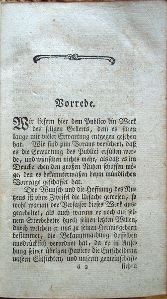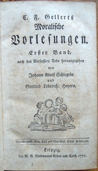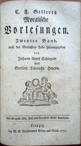 C. F. Gellerts Moralische Vorlesungen. Erster [-Zweyter] Band, nach des Verfassers Tode herausgegeben von Johann Adolf Schlegeln und Gottlieb Leberecht Heyern. Mit allergnäd. Röm. Kais. und. Churfürstl. Sächs. Privilegiis