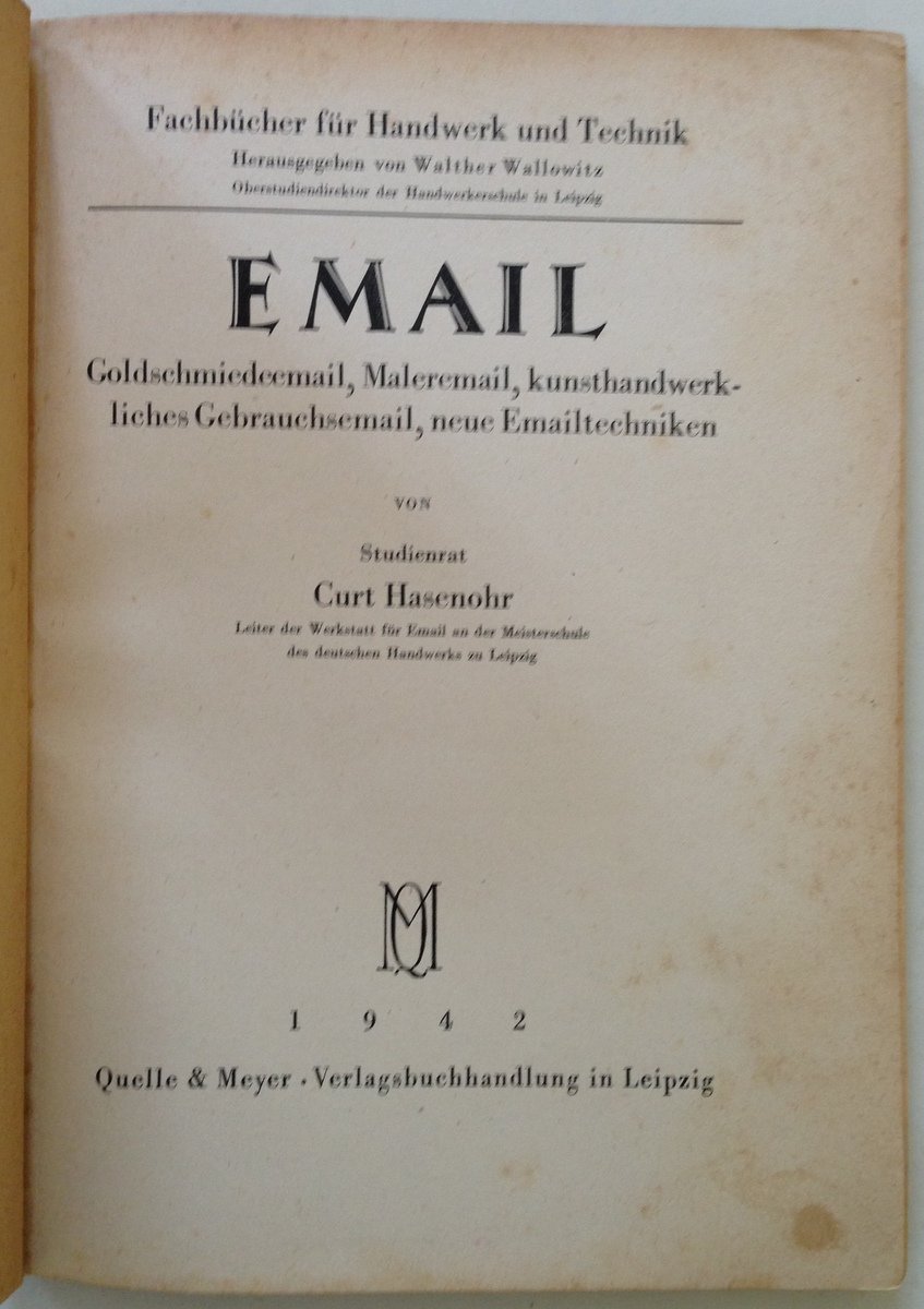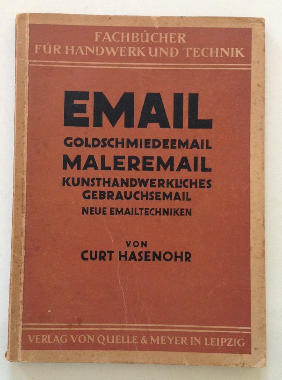 C. Hasenohr, Email Goldschmiedeemail Maleremail Kunsthandwerkliches Gebrauchsemail Neue Emailtechniken Quelle&Meyer. Leipzig, 1942; cm. 22,5x16,5; pp. 77; con 32 tavv. in b/n f.t. e a p.pag.; br. ed.; testo in lingua tedesca. Condizioni di conservazione Esemplare in buone condizioni con leggere tracce d'uso; brossura editoriale e interni con bruniture. SETT170.L15319 MT