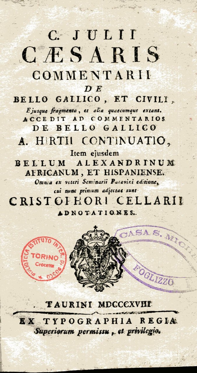 C. Julii Caesaris Commentarii de bello Gallico, et civili, ejusque fragmenta, et alia quaecumque extant. Accedit ad Commentarios de bello Gallico A. Hirtii continuatio, item ejusdem bellum Alexandrinum, Africanum, et Hispaniense. Omnia ex veteri Seminarii Patavini editione, cui nunc primum adjectae sunt Cristophori Cellarii Adnotatione