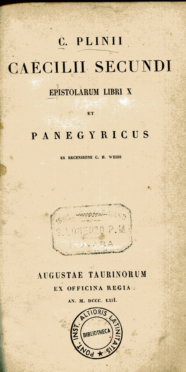 C. Plinii Caecilii Secundi Epistolarum libri X et Panegyricus ex recensione C. H. Weise. Unito a : Scriptores historiae augustae : Aelius Spartianus, Vulcatius Gallicanus, Iulius Capitolinus, Trebellius Pollio, Aelius Lampridius, Flavius Vopiscus a cura di Thomas Vallarius, Augustae Taurinorum, ex Officina Regia, 1853