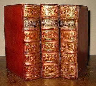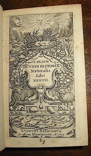 12mo (cm. 11), 3 Voll., 6 cc.nn. (compreso frontis. interamente inciso su rame), 654 pp., 9 cc.nn.; 631(16) pp.; 582 pp., 9 cc.nn. Splendide legature coeve in marocchino rosso con nervi, ricchissimi fregi e titolo in oro su tassello nero al ds. Piatti incorniciati da duplici fili oro, dentelle decorate, tagli oro. Carte di guardia marmorizzate con disegno a pettine. Insignificanti abrasioni ai piatti di due voll., piccoli tagli alle cerniere e lievi aloni sulle ultime carte del terzo vol., ma nel complesso ottimo esemplare. Willems, n. 428: ‘Cette édition de Pline, la seule que les Elzevier aient publiée, a été revue par Jean de Laet. Elle passe à bon droit pour un de leurs chefs-d’oeuvre. Les exemplaires bien conservés se trouvent difficilement’. Provenienza: collezione Wardington (Ex libris cartaceo ai contropiatti posteriori).
