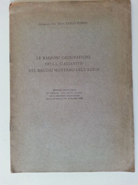 GENERALE SE. DOTT. CARLO PORRO LE RAGIONI GEOGRAFICHE DELL'ITALIANITA' BACINO MONTANO DELL'ADIGERAPPORTO TENUTO NELLA XIX RIUNIONE DELLA SOCIETA' ITALIANA PER IL PROGRESSO DELLE SCIENZE BOLZANO TRENTO 7-15 SETTEMBRE 1930
