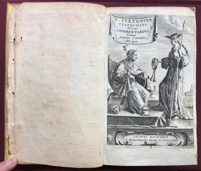Lugduni Batvorum, Ex Officina Francisci Hackii, 1662. Editio Quarta. In 8vo lungo, front. inciso a p. p., pp. 30, 845, ne seguono circa 85 n. n. con le notizie di alcuni filosofi e a seguire l'Index, testo latino, 11 incisioni finemente incise in b/n n. t. illustrano gli undici imperatori romani: Julius Caesar, Octavius Augustus, Tiberius Nero Caesar, C. Caesar Caligula, T. Claudius Drusus Caesar, Ser Sulpicius Galba, M. Salvius Otho, A. Vitellius, T. Flavius Vespasianus, Titus Flavius Vespas. Aug., Titus Flavius Domitianus, leg. orig. in tutta perg. rigida con tit. mns. al dorso. Ottimo stato di conservazione. Gaius Suetonius Tranquillus, scrittore romano d'età imperiale, nato secondo alcuni in Algeria, secondo altri in un luogo imprecisato del Latium vetus, forse Ostia (70 d. c. - 126 o 140 d. c.) da una ricca famiglia di ceto equestre (il padre, Svetonio Leto, era tribuno militare). Svetonio studiò retorica e giurisprudenza, divenendo avvocato. A Ostia avrebbe ricevuto la carica religiosa locale di pontefice di Vulcano (solitamente conferita a vita). Svetonio rifiutò la carriera di amministratore o di soldato riservata in genere al suo rango. Le scarse notizie che di lui abbiamo le desumiamo dalle sue stesse opere e da Plinio, che in una lettera a Traiano ne sottolinea la rettitudine e l'erudizione. Fu un erudito, autore di molte opere, anche in greco, amante degli studi più che della vita pubblica. Fu uomo di gusti raffinati e rara sensibilità, antiquario e studioso con grande interesse per le antichità e la cultura romana.