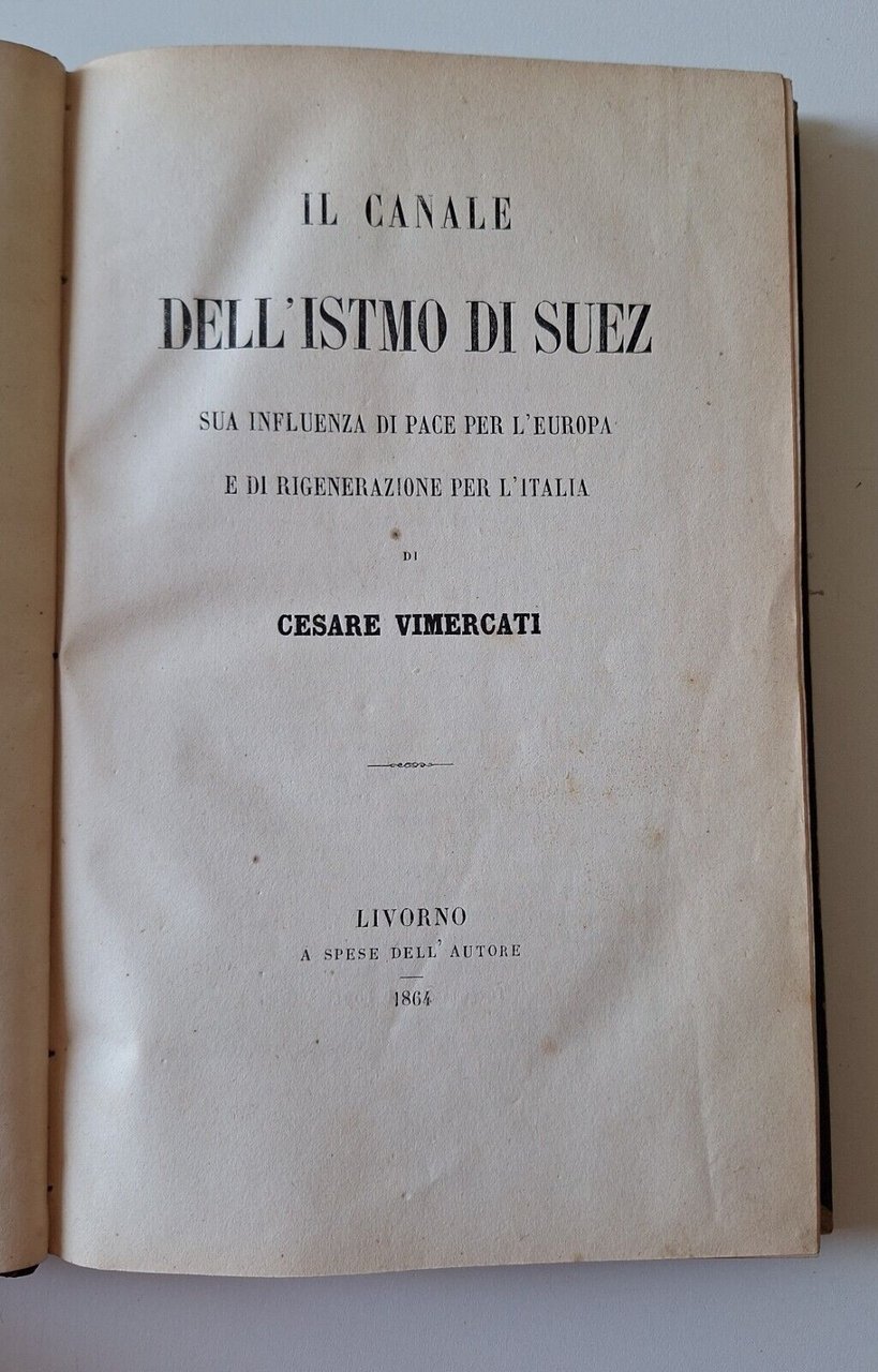 C. VIMERCATI IL CANALE DELL'ISTMO DI SUEZ SUA INFLUENZA DI PACE PER L'EUROPA E DI RIGENERAZIONE PER L'ITALIA LIVORNO 1864In 8°, legatura in mezza pelle con titolo in oro al dorso.Lievissimi segni alla legatura. Pagine fresche e pulite.