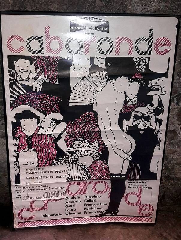 Manifesto di cm. 100x70 disegno a due colori siglato Sinplicissimus. (manifesto della prima rappresentazione). Tra gli Interpreti:- Daniela Anselmo,- Aleardo Caliari, - Gerri Franceschini, - Laura Pantalone, - Pianoforte, Giovanni Primavesi. -(Alerdo Caliari,1946, - 2022, debutta nel 1967 come cabarettista chansonnier alla “Cassina di pomm” di Gino Negri per passare poi al “Nebbia Club” di via Canonica dove lavora con Franco Nebbia e conosciuto Milly, Paolo Poli, Walter Valdi, Lino Patruno ed altri grandi artisti e personaggi del cabaret milanese di quegli anni. Nel 1979 ha fondato la compagnia teatrale La casa di via Torino (così chiamata dalla casa di ringhiera in cui si facevano le prove) debuttando al Teatro Arsenale (1980) nel triplice ruolo di Autore, interprete e Regista di compagnia.con lo spettacolo Cabaronde , frutto di una ricerca sul Cabaret Cafè Chantant europeo Primonovecento.). Applicato al manifesto un richiamo dove si annuncia lo spostamento in locale al chiuso in caso di pioggia. Leggeri segni di piegatura.