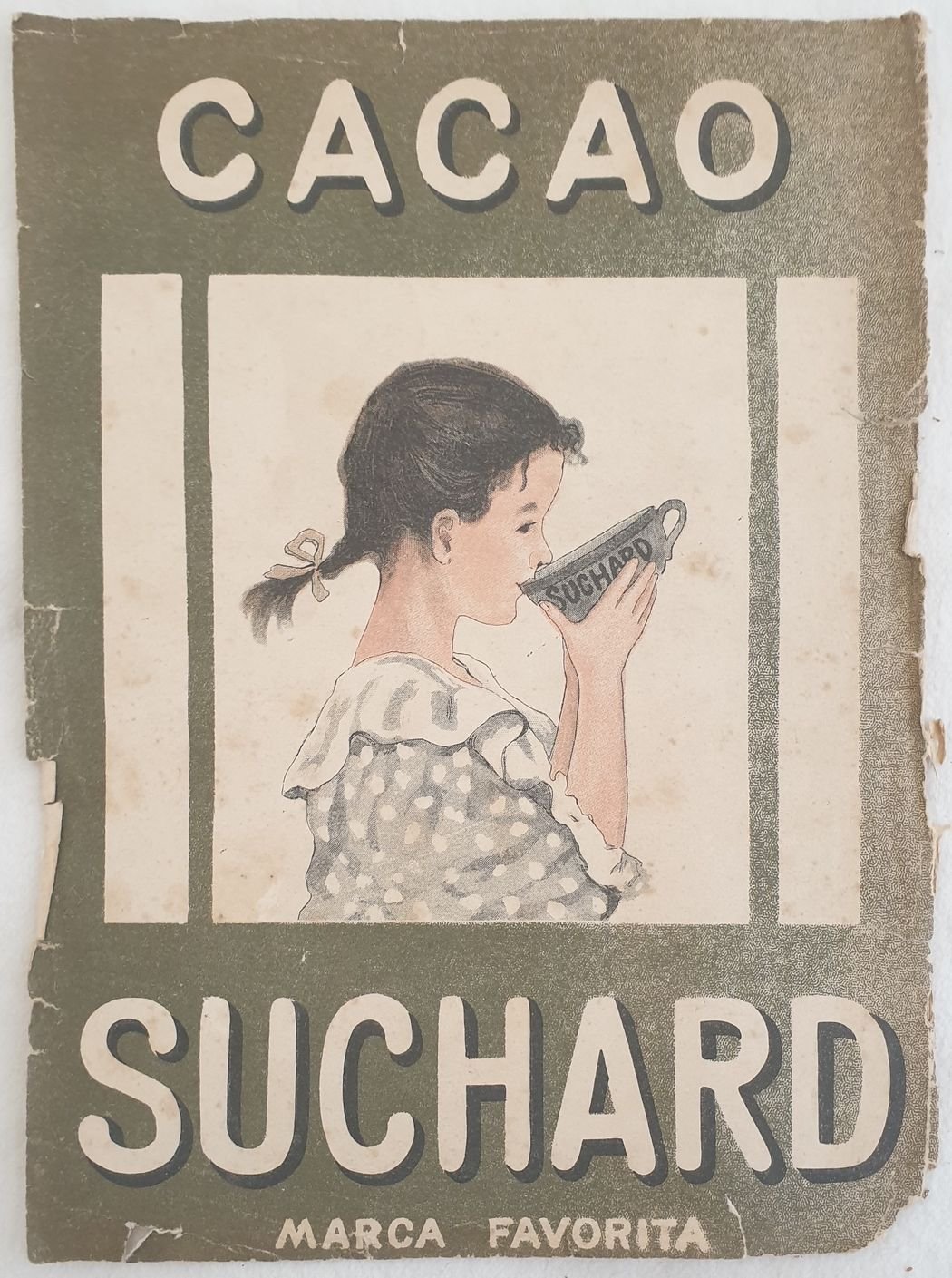 Pubblicità degli anni '20 del cacao Suchard. In discrete condizioni con strappi laterali. Al verso pubblicità di liquidazione di una libreria. In 4. Dim. 25x18,5 cm. Advertising of 1920's of chocolate Suchard. In fair conditions with tears in the edges. In the verso advertising of a liquidation of a library. In 4. Dim. 25x18,5 cm.