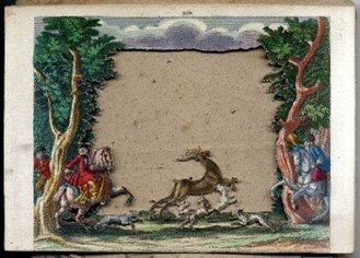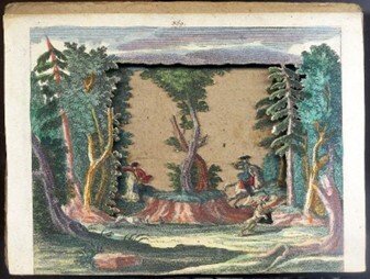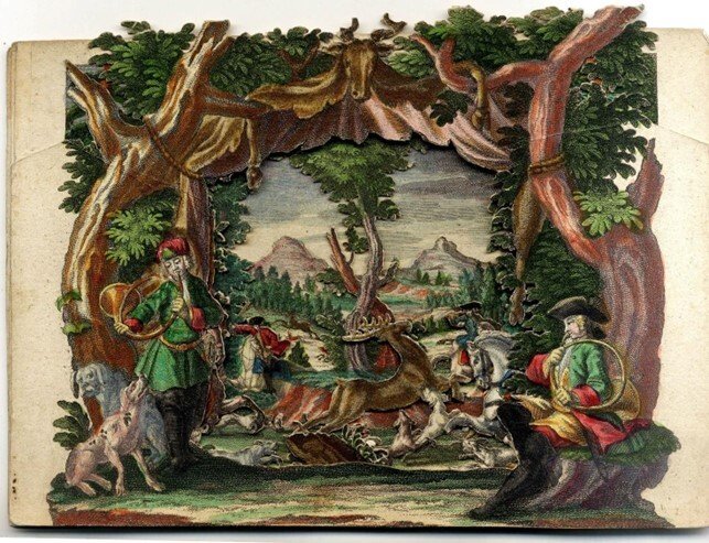 >serie completa di sette incisioni su rame colorate e ritagliate a mano (165 x 230 mm) montate su cartoncino, 7 incisioni numerate 365-371 al margine superiore (il frontespizio num. a mano al recto). Molto probabilmente il margine inferiore, dove c'era la firma "Cum Priv. S.C. Maj. - Mart. Engelbrecht excud. A.V" e il numero della serie al centro è stato rifilato. Montate consecutivamente e disposte fronte-retro all'interno di una scatola da esposizione, le lastre ritagliate creano una veduta in prospettiva tridimensionale. La scena ritratta è molto dettagliata, con cacciatori a cavallo, cani da caccia e cacciatori con trombe immersi in un bosco, con montagne sullo sfondo. Lievi segni di usura, un po' polveroso, colori molto brillanti e taglio accurato; nel complesso un ottimo set, specie considerato il suo utilizzo per quasi tre secoli, completo anche della coperta in cart. rustico originale, titolo ms. in tedesco su tassello.