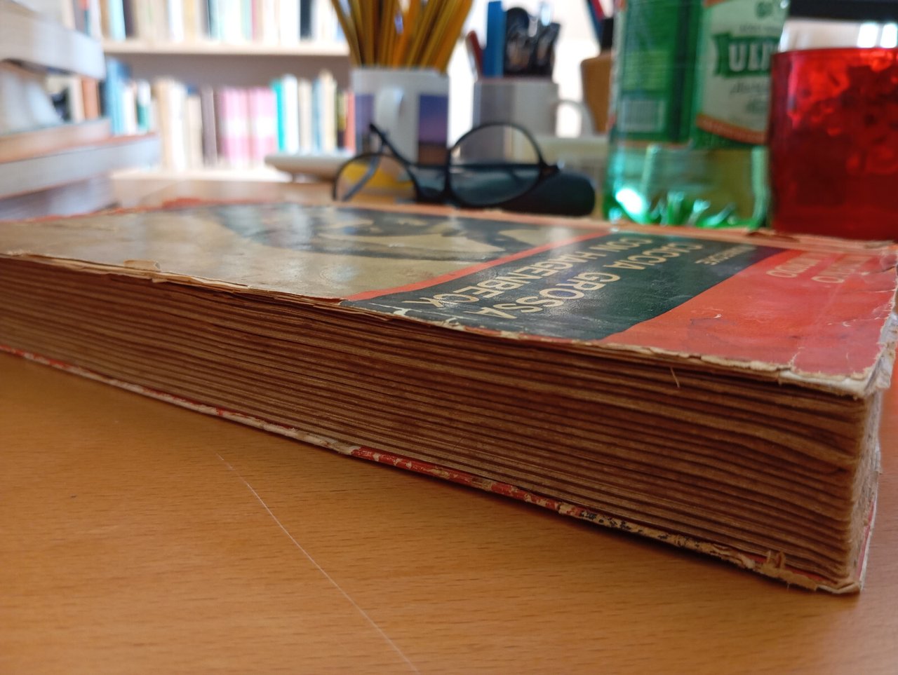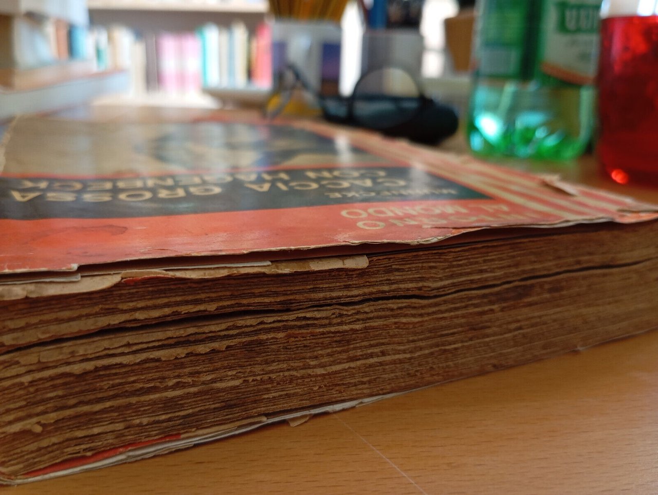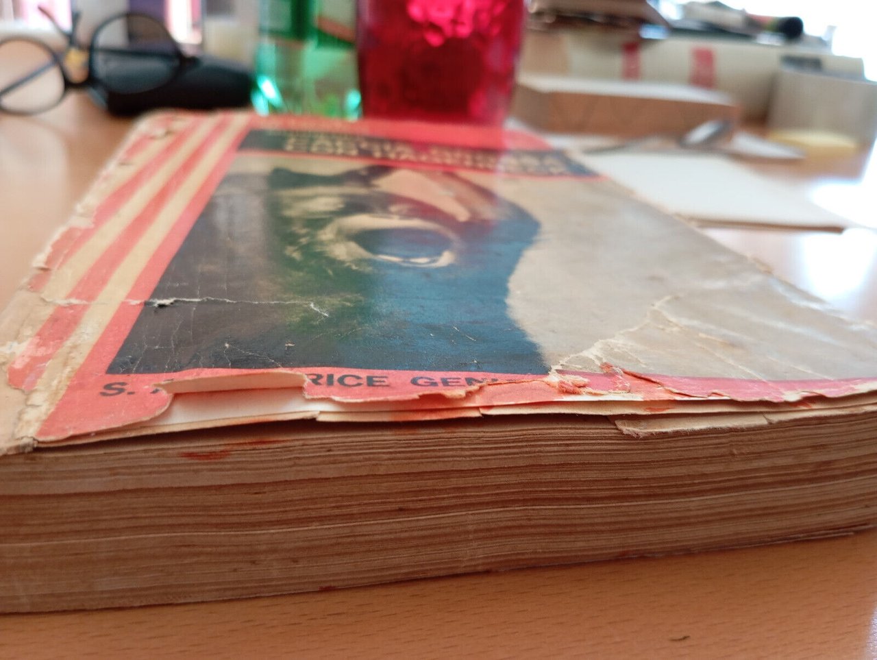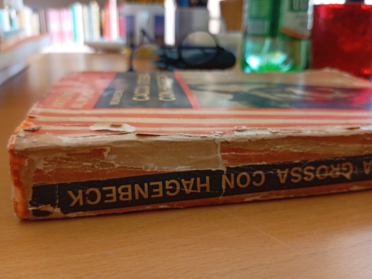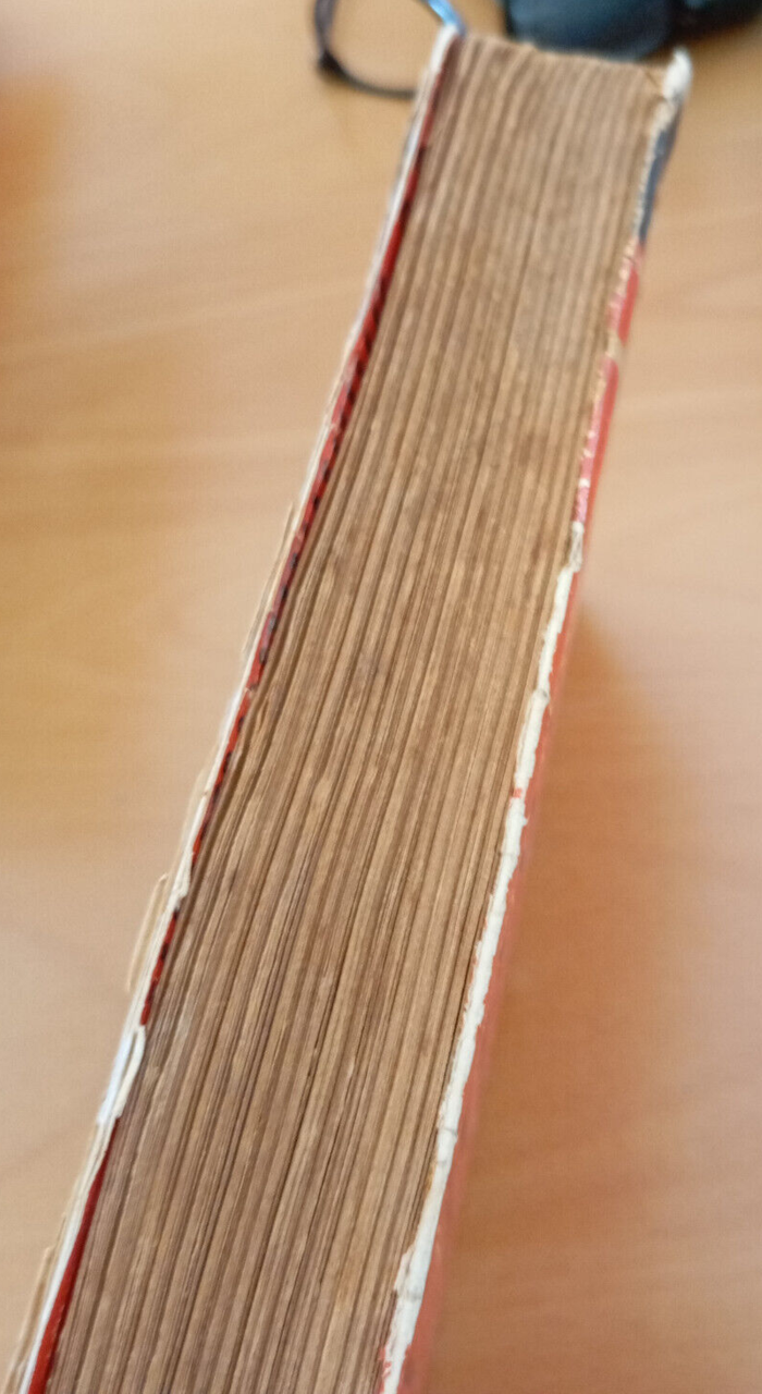 Sovracopertina con strappi e segni di usura. La socracopertina è attaccata in modo non rimovibile alla copertina interna, dorso danneggiato, forti scuriture, legatura con alcuni cedimenti ma non compromessa, come da foto