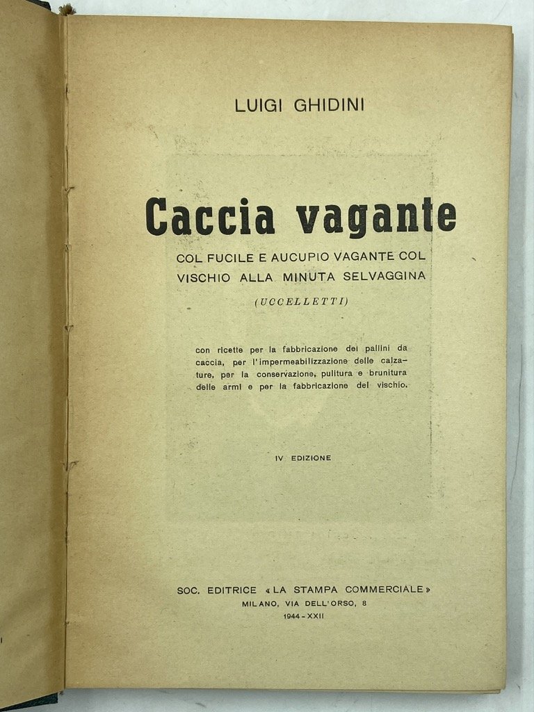 CACCIA VAGANTE COL FUCILE E AUCUPIO VAGANTE COL VISCHIO ALLA MINUTA SELVAGGINA (UCCELLETTI), con ricette per la fabbricazione dei pallini da caccia, per l’impermeabilizzazione delle calzature, per la conservazione, pulitura e brunitura delle armi e per la fabbricazione del vischio. IV Edizione.