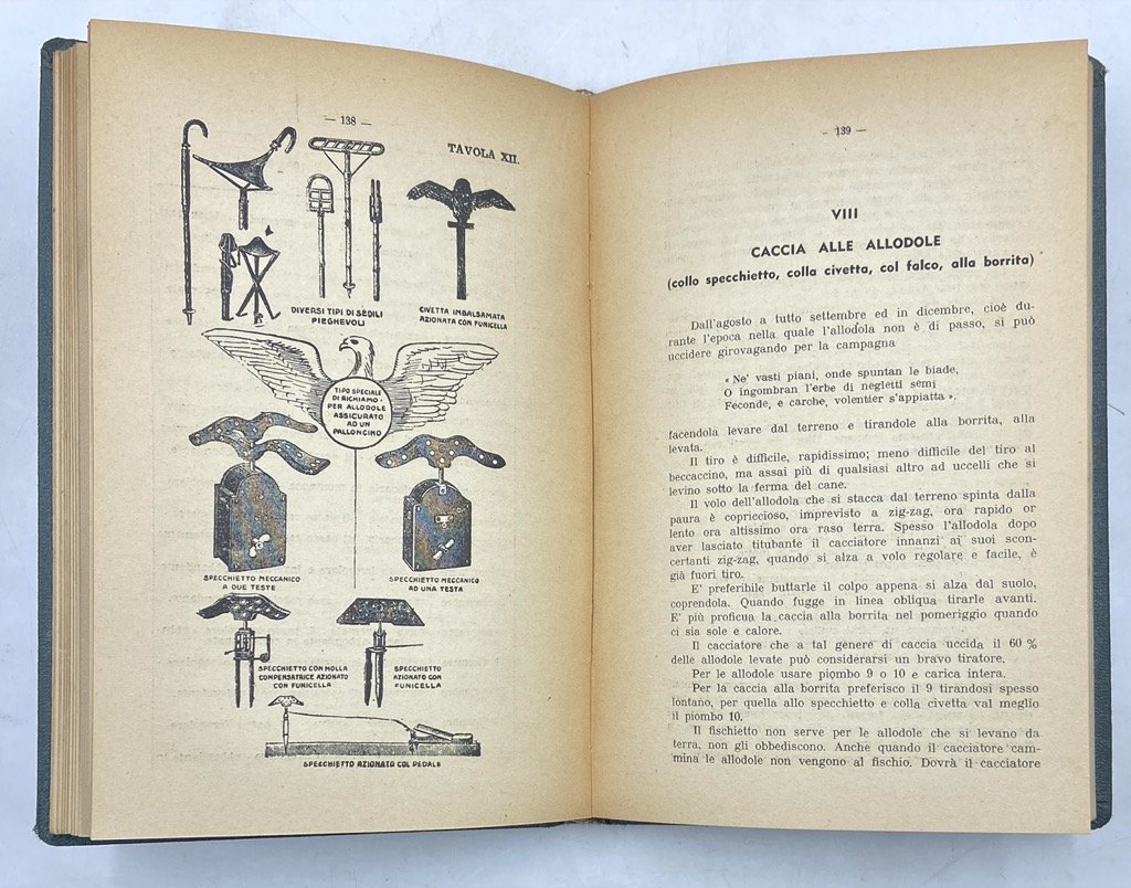 Legatura non editoriale in tela con titoli sul dorso, cm 21 x 14, pp 231 (1), ritratto fotografico in nero dell’autore e XXVII tavole, quattro delle quali a colori su carta patinata. Rilegato, carte un poco brunite ma complessivamente ben conservato. Quarta edizione, pubblicata a vent'anni dall'originale e poco dopo la scomparsa dell’autore, del primo libro di Ghidini, dedicato alla caccia «più aderente alla sua consuetudine venatoria», quella vagante alla minuta selvaggina. Il libro si apre con un ricordo di Franco Ceroni Giacometti che ripercorre la cospicua e fortunata bibliografia di Ghidini, uno dei più fecondi autori della letteratura venatoria italiana; la prima parte dell’opera è dedicata alla caccia vagante col fucile e tratta della scelta e cura dell’arma, delle munizioni, accessori e richiami, della caccia alle allodole con lo specchietto, la civetta, il falco, alla borrita, della caccia ai pivieri e pavoncelle, delle caccie semivaganti; la seconda parte tratta della cattura degli uccelli col vischio (già vietata in forma vagante dal codice venatorio ma il testo fu mantenuto in quanto «unico trattatello moderno sull'argomento») con la civetta o i richiami; la terza parte è costituita da un elenco degli specie di volatili oggetto di caccia, con nomi latini e dialettali, e la quarta contiene le appendici sulla conservazione della selvaggina e sulla situazione normativa. Ceresoli, p. 274: «Quest'opera (.) è a tutt'oggi l'unica che tratti specificamente della caccia agli uccelletti col vischio e col fucile: è una delle opere classiche moderne sull'uccellagione».