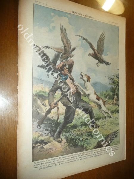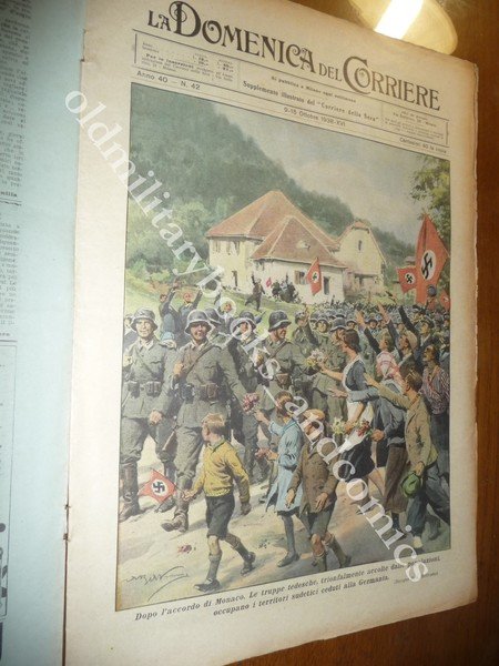 DESCRIZIONE: Domenica del Corriere, Milano, Anno 40 n. 42 (9 ottobre 1938). COPERTINA: Dopo l'accordo di Monaco le truppe tedesche entrano nei Sudeti. RETRO: Un cacciaciatore di Gattinara dopo aver abbattuto un falco, presso Borgosesia, viene assalito da altri 3 rapaci. Lo salva il suo cane. La Domenica del Corriere è stato un popolare settimanale italiano fondato a Milano nel 1899 e chiuso nel 1989. Apparve per la prima volta nelle edicole l'8 gennaio 1899 come supplemento illustrato del Corriere della Sera. Stampata in grande formato (sul modello del domenicale La Tribuna illustrata), aveva 12 pagine e veniva distribuita gratis agli abbonati del Corriere, oppure si poteva acquistare in edicola per 10 centesimi. La prima e ultima di copertina erano sempre disegnate. Il Corriere si avvaleva di un giovane disegnatore, Achille Beltrame, allora sconosciuto, a cui veniva affidato in ogni numero il compito di rendere con la sua tavola il fatto più interessante della settimana. Dopo la sua morte nel 1945, fu sostituito da Walter Molino che, come il suo predecessore, firmò memorabili copertine. A differenza dei settimanali dell'epoca, la Domenica del Corriere diede ampio spazio alle fotografie e ai disegni, e questo fu uno dei motivi del suo successo. CONDIZIONI: Ottime con azzurrina. PESO / WEIGHT: 200 gr. without package