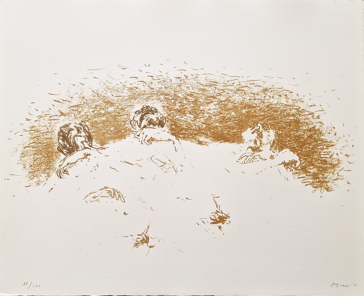 In folio ad album (46x56); pp. 40 non num. 4 a quartini sciolti su carta a mano della Filicarta filigranata, carattere Garamond; con 7 litografie, di cui 5 a piena pagina e 2 nel testo, tutte firmate e numerate a matita dal Maestro, tirate a Parigi da Desjobert. Racchiuso in cartella-astuccio in cartone edit. con titoli al dorso e al piatto; edizione tirata a 130 esemplari numerati, oltre a XXV f.commercio. Il testo poetico di De Solier è in francese ed è ispirato alle litografie, ricordo della deportazione di Music a Dachau in Germania.<BR>(vedi riproduz.)